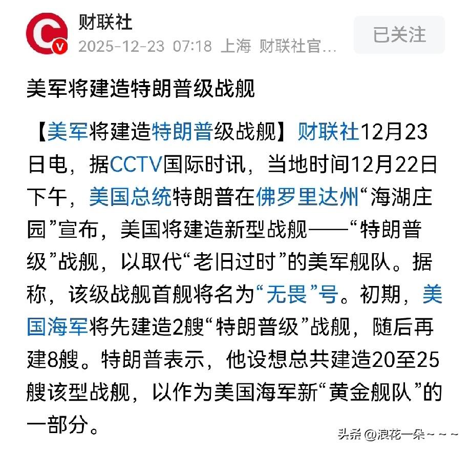 逗逼[捂脸] “特朗普级”战舰群要来了?特朗普现在做的是要青史留名的节奏啊。他要把海军打造成一支有自己名字命名的“黄金舰队”?! 有网友说,特朗普这是在建造一只“靶舰”。 有网友说,你这名字取的不够刺激,得叫“海盗舰”…等等! 怎么说呢?特朗普剩余任期还有三年,建造一艘战舰,从设计到开工到测试成功,没个三五年应该下不来吧?三年以后,下一任总统不是他的话,会不会给战舰改名还不一定呢。 更关键的,美国的造舰能力现在可不是以前了,以前可以说用下饺子来形容,现在造舰能力就像挤牙膏,何况护卫舰和驱逐舰等项目频频延期或取消。 理想很丰满,现实很骨,感特朗普以国为家的理念不错[捂脸]。特朗普战舰能不能真正落实下去,有待进一步观察,就算逗MAGA们乐一乐好了。