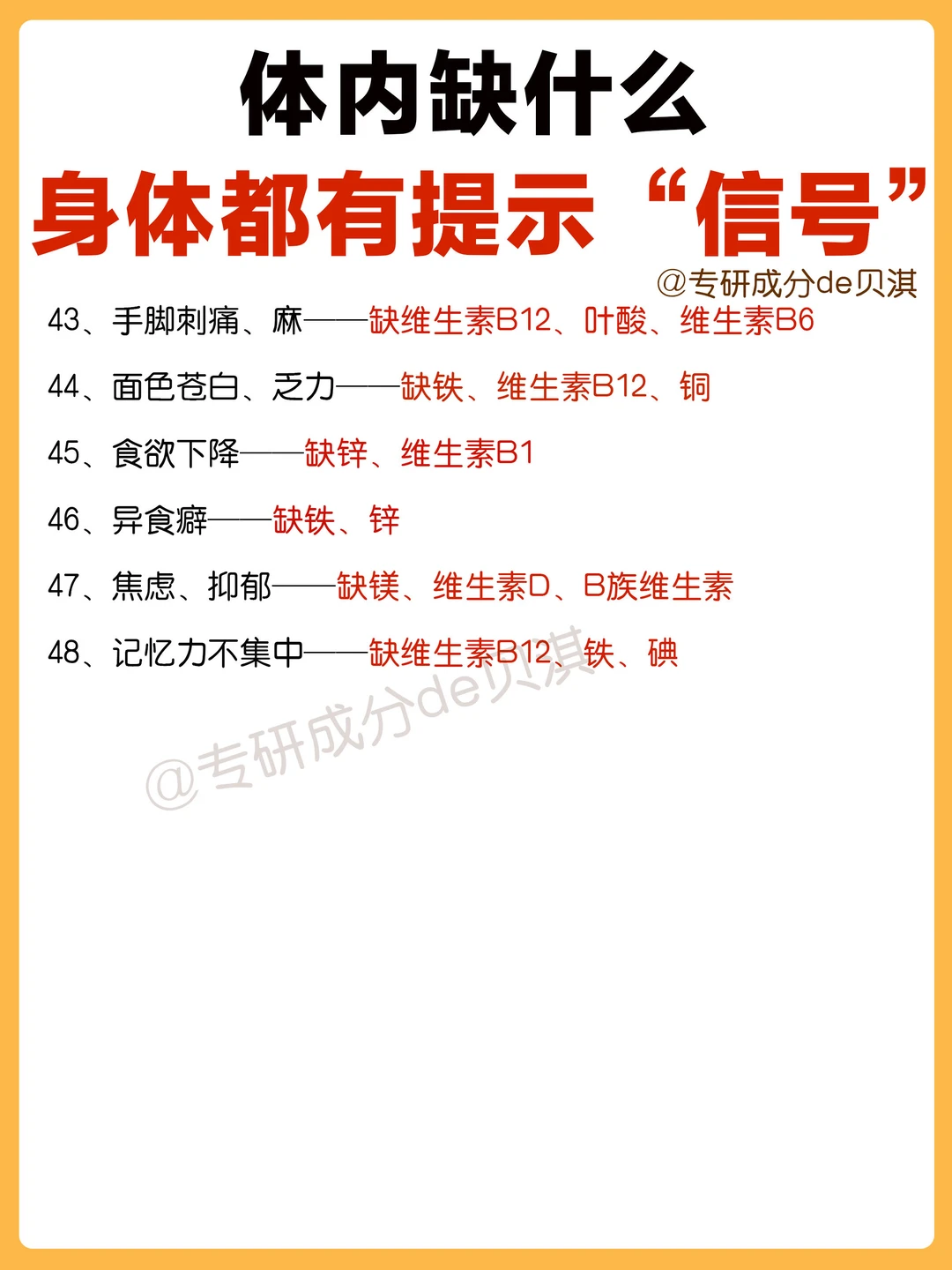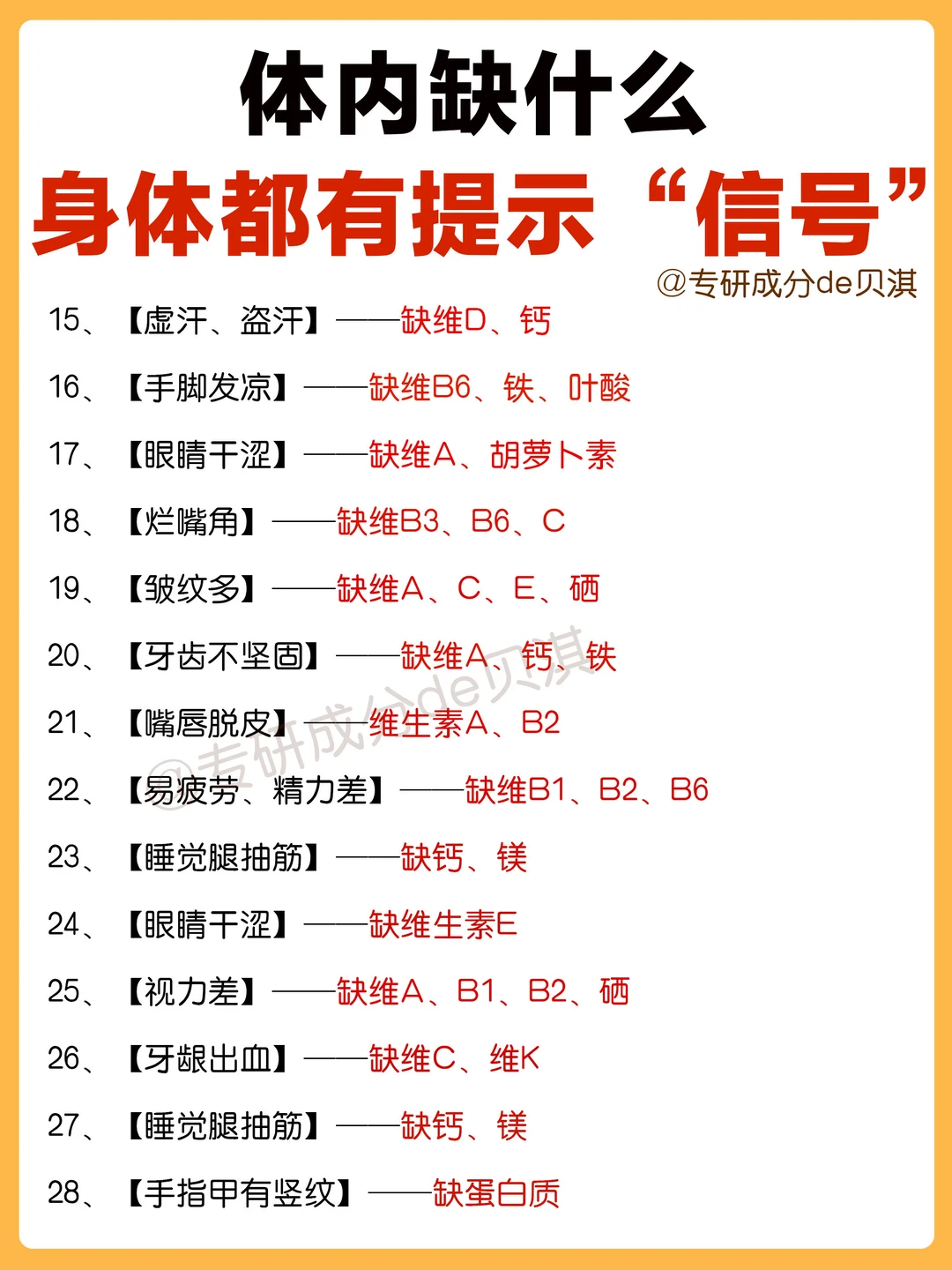 看看身体都中了哪些提示? 建议转给老公和朋友一起看! 维生素一般无法由身体以及生产,需要通过饮食摄取。 🌟要分开吃的营养素 [一R]钙➕鱼油 钙可能干扰鱼油中Omega-3脂肪酸的吸收,建议分开时间服用 [二R]钙➕铁 如果同时服用,可能竞争吸收路径,建议隔2小时以上 [三R]益生菌➕抗生素 建议隔2小时以上 [红色心形R]搭配CP ✅铁➕VC 维生素C能促进铁的吸收,预防贫血 ✅钙➕VD 维生素D帮助钙吸收,助力钙沉积 ✅VA➕VK 同为脂溶性维生素,搭配油脂食物吸收更充分