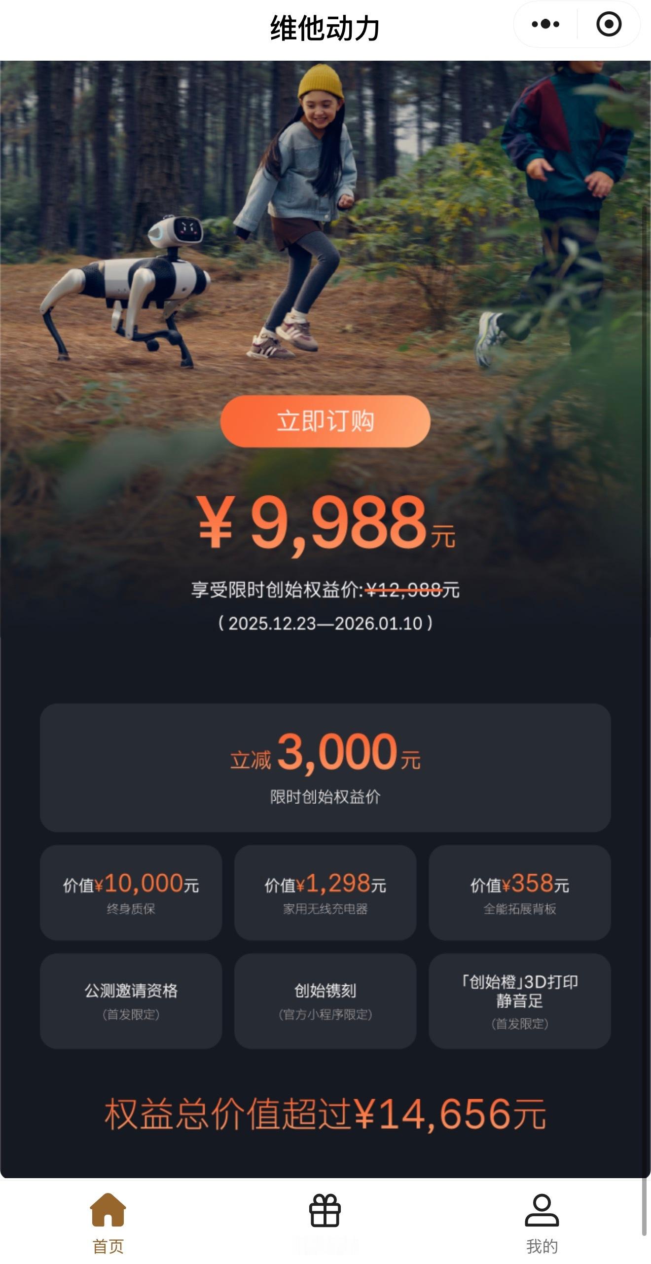大头波波的最终售价是:12988元!购买创始版的话还有11656的相关权益赠送,同时,还能再降3000,也就是说9988元,创始版带回家!在对比行业目前的同类机器狗产品,在硬件,软件和设计上都有巨大领先的情况下。价格还能做到遥遥领先!这不得爆了~先买一台,78位机器狗