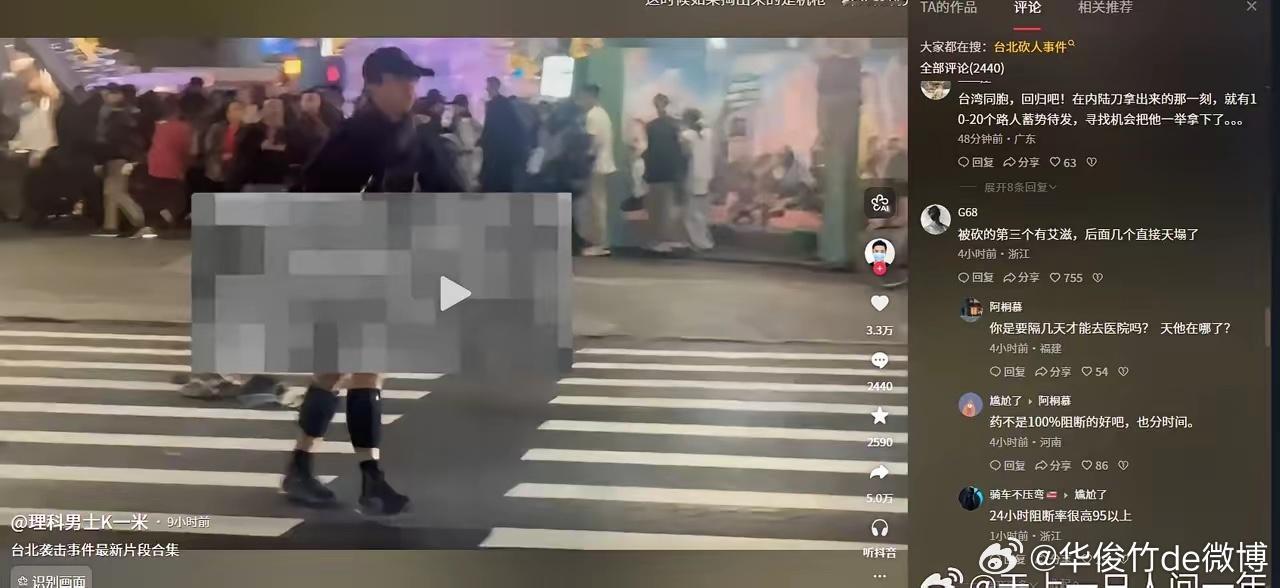 近日的台北街头砍人事件,砍到第三人时,砍到艾滋感染者了,而凶手后续又砍了十来人,也就说是,带着艾滋血液的砍刀,又砍染了后续十多人。台湾的艾滋感染率这么高了嘛??砍第三人时就给刀带上艾滋buff了。是不是和性开放有关以及同志婚姻有关?很多人都麻木的站在街上,丝毫不知道发生什么,毫无危险意识。人真的不能承平太久。至少要时不时看看惊悚电影或者恐怖电影提升危险意识才行。全网热点共创计划华俊竹有话说