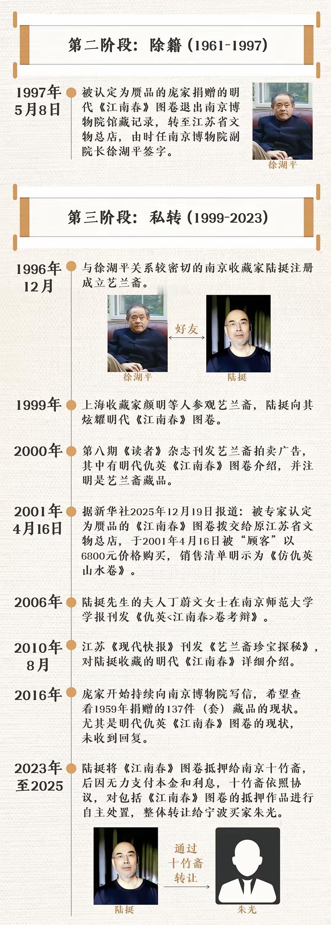 更多细节曝光,原来《江南春》送拍人并不是陆挺,而是宁波人朱光,目前谁也没见过这位神秘大佬,而且在收藏界了无声息。 新闻媒体还得是澎湃新闻,通过走访调查将《江南》流传时间线和人物关系搞得清清楚楚。 1997年5月8日,庞家捐赠的《江南春》画卷被南博以伪作退出馆藏,转至江苏省文物总店,副院长徐湖平签字。 这幅引发热议的《江南春画卷》,其背后的流转故事远比想象中曲折。时间拉回1959年,收藏家庞增和将毕生珍藏的137幅古画无偿捐赠给南京博物院,其中便包括这幅署名明代画家仇英的作品。在那个文物保护意识逐渐觉醒的年代,这样的捐赠无疑是对文化传承的重要贡献,庞家的这份情怀也一直被业内所称道。 然而,时隔38年后的1997年,这幅画作的命运迎来了转折。经南京博物院两次专家鉴定,《江南春画卷》被认定为“伪作”,随后按照相关规定退出馆藏,转交给了江苏省文物总店,时任副院长徐湖平在处置文件上签字确认。在文博行业中,文物鉴定本就是一项兼具专业性与主观性的工作,即便是资深专家,也可能因时代局限、技术条件等因素产生不同判断,这一处置在当时看来,似乎是符合行业规范的操作。 真正让事件发酵的,是这幅“伪作”在多年后现身拍卖市场,给出了8800万元的估价。而送拍人的身份更是迷雾重重,最初流传的“陆挺”之说被推翻,澎湃新闻通过实地走访、多方求证,最终锁定送拍人是宁波人朱光。但这位关键人物却如同“隐形人”一般,不仅无人见过其真面目,在收藏界更是没有任何公开记录,既没有参与过知名拍卖会,也未与业内藏家有过交集,其手中为何会持有这幅流转自文物总店的画作,至今仍是未解之谜。 随着时间线的逐渐清晰,公众的关注点也从画作真伪延伸到文物流转的全流程。从庞家的无偿捐赠,到南博的鉴定处置,再到神秘藏家的送拍,每一个环节都牵动着大家的神经。有人感慨文物命运的跌宕起伏,一幅古画在半个多世纪里历经捐赠、鉴定、流转、拍卖,背后牵扯着多方利益与复杂人情;也有人关注文物鉴定的严谨性,“伪作”的认定标准是什么?多年后的市场估价是否意味着当初的鉴定存在偏差?这些疑问都需要更权威的调查来解答。 目前,国家文物局已成立工作组,江苏省委省政府也组建了调查组,全面介入核查此事。无论是画作真伪的重新认定,还是文物流转过程的合规性审查,相信都会给出客观公正的结论。这一事件也为文博行业敲响了警钟,文物的鉴定、保管、流转等各个环节都关乎文化遗产的保护与传承,容不得半点马虎。 各位读者你们怎么看?欢迎在评论区讨论。南京博物院 庞家
