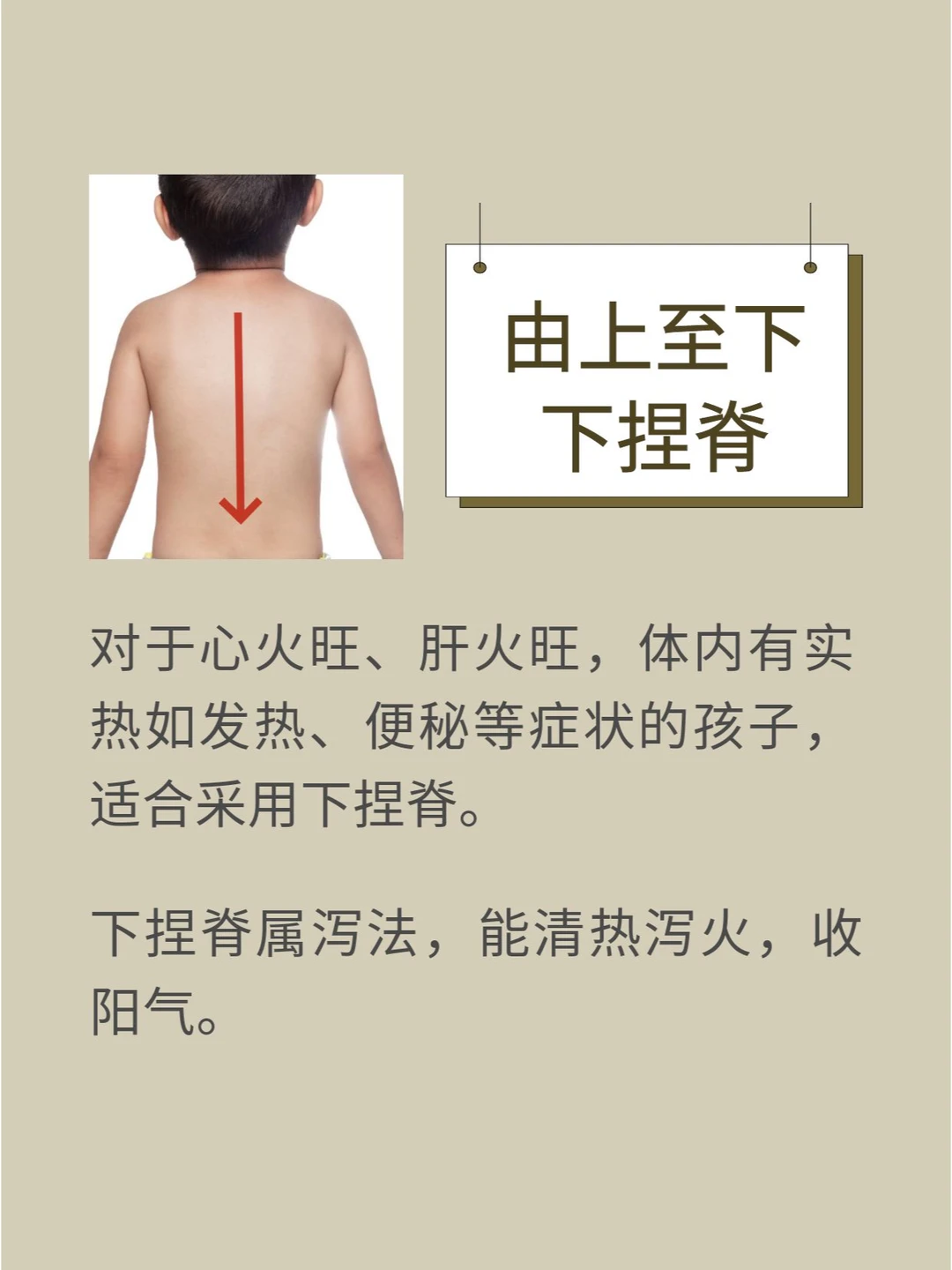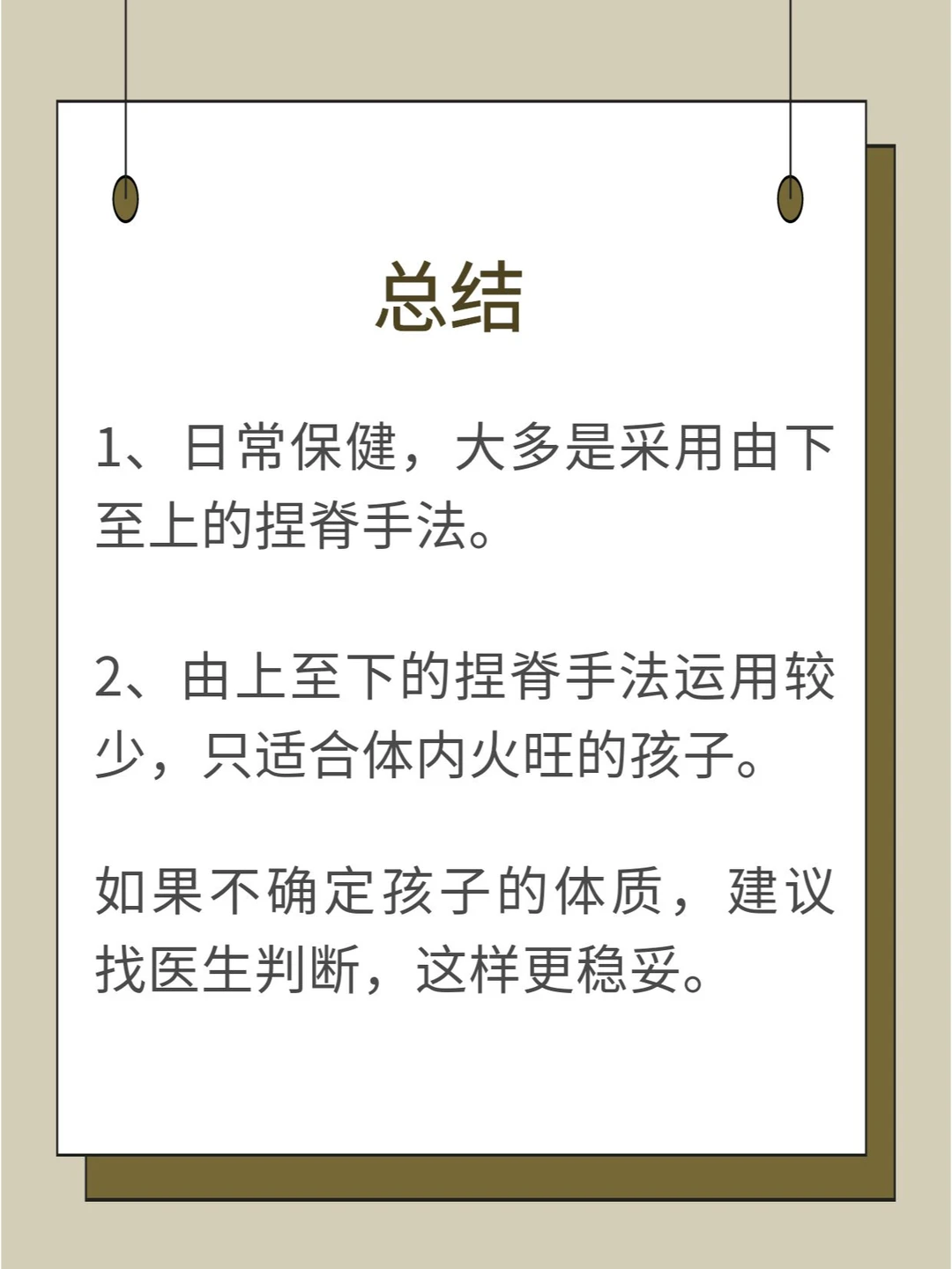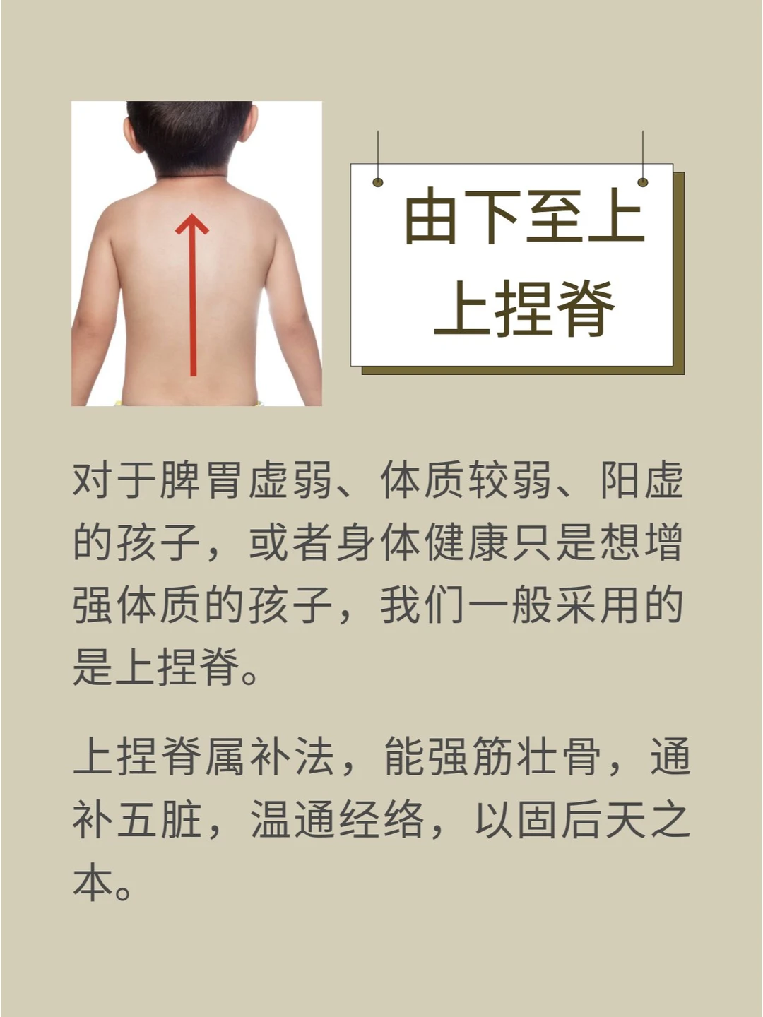 对于捏脊的操作手法,家长们应该都有所了解,在孩子的背部,双手一紧一松交替挤捏,能够疏通、刺激经络,促进孩子的生长发育。 但就是在操作顺序上,很多家长都犯了糊涂。 往上捏?向下捏?哪个方向正确?有什么区别吗? 实际上,方向相反,作用可大不一样! ✅上捏脊属补法,多用于日常保健,能强筋壮骨,通补五脏,温通经络,以固后天之本。 ✅下捏脊属泻法,运用较少,能清热泻🔥,收☀️气。 如果不确定孩子的体质,建议找医生判断,这样更稳妥。 捏脊的方向不要搞错,每天给孩子捏3~5遍,孩子会在您的呵护下茁壮成长哦!