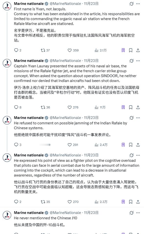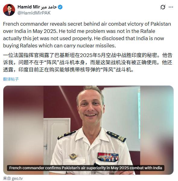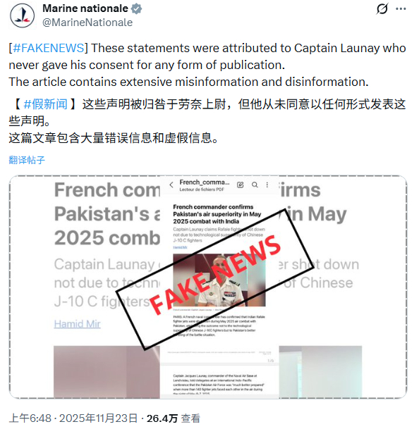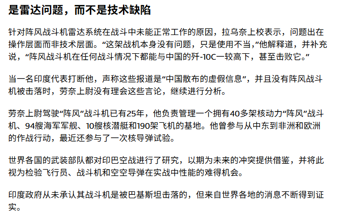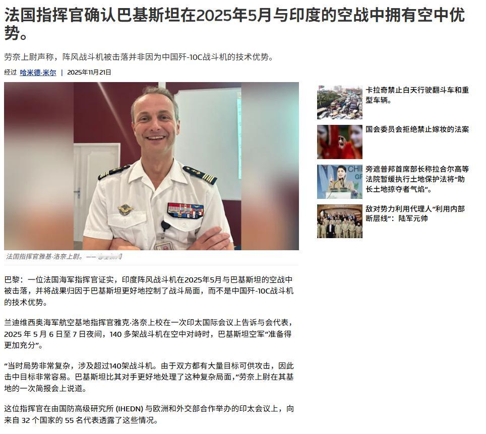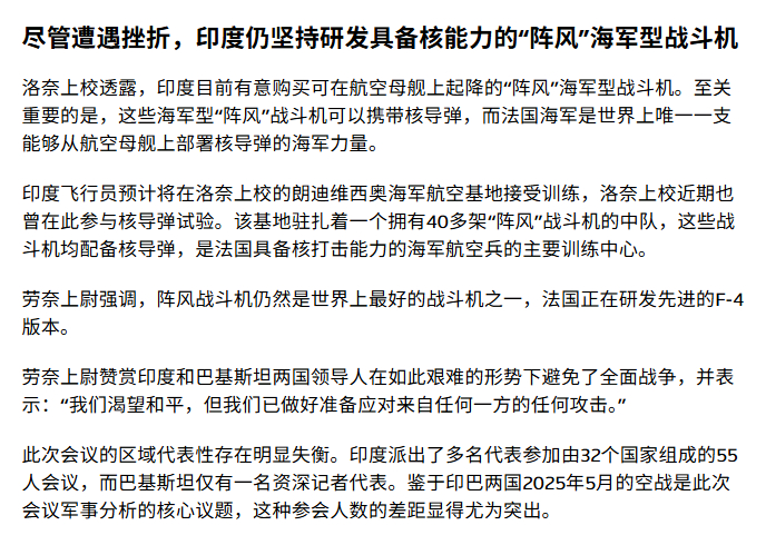 11月,巴基斯坦Geo TV报道了一位法国海军指挥官参加国际会议时的发言,这位指挥官称印度阵风战斗机在今年5月与巴基斯坦的空战中被击落,并将战果归因于巴基斯坦更好地控制了战斗局面,而不是中国歼-10C战斗机的技术优势。针对阵风战斗机雷达系统在战斗中未能正常工作的原因,这位上校表示,问题出在印度空军操作层面而非技术层面。“这架战机本身没有问题,只是使用不当,”他解释道,并补充说,“阵风战斗机在任何战斗情况下都能与中国的歼-10C一较高下,甚至击败它。”每天认识一件兵器烽火问鼎计划 当一名印度代表打断他,声称这些报道是“中国散布的虚假信息”,并且没有阵风战斗机被击落时,法国上校没有理会这些言论,继续进行分析。不过随后法国海军针对该报道指责巴基斯坦媒体散布错误和虚假信息,法国海军称这位上校在会议上既没有证实也没有否认印度飞机是否被击落,并且拒绝就中国系统可能干扰印度“阵风”战斗机一事发表评论。他以战斗机飞行员的身份表达了自己的观点,认为由于大量信息涌入驾驶舱,飞行员在空战中可能会面临认知超载,这会导致态势感知能力下降,而这与飞机的数量无关。他从未提及中国的歼-10战斗机。