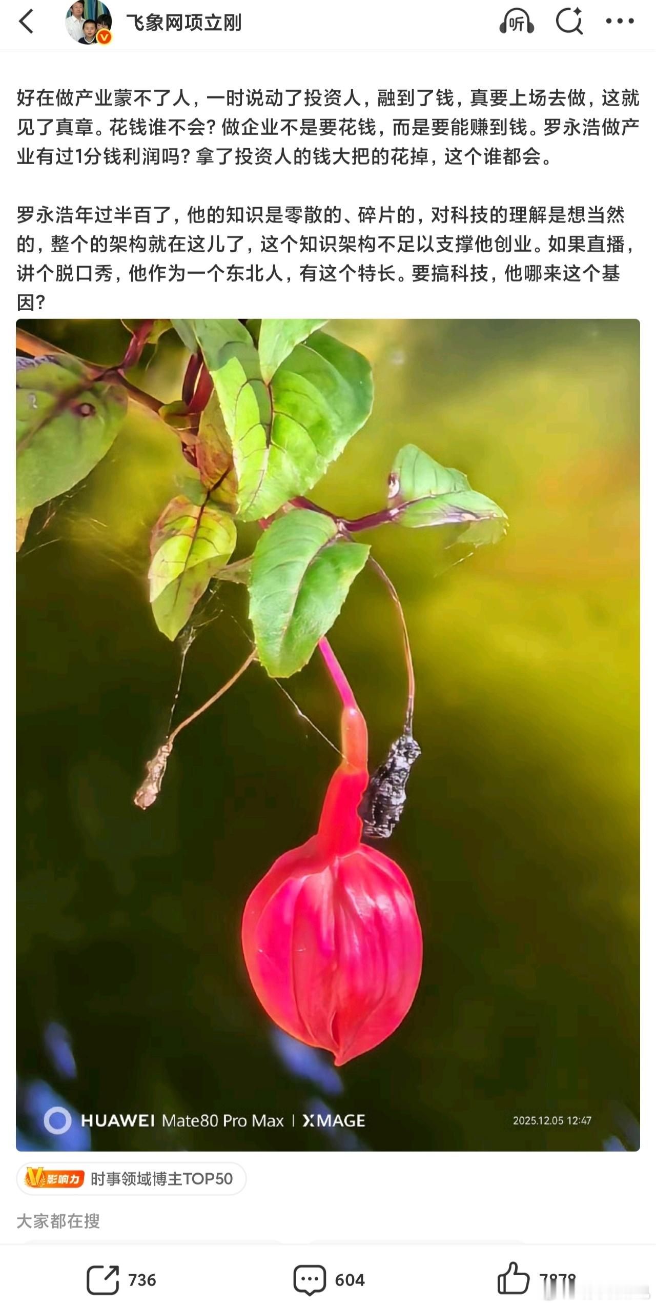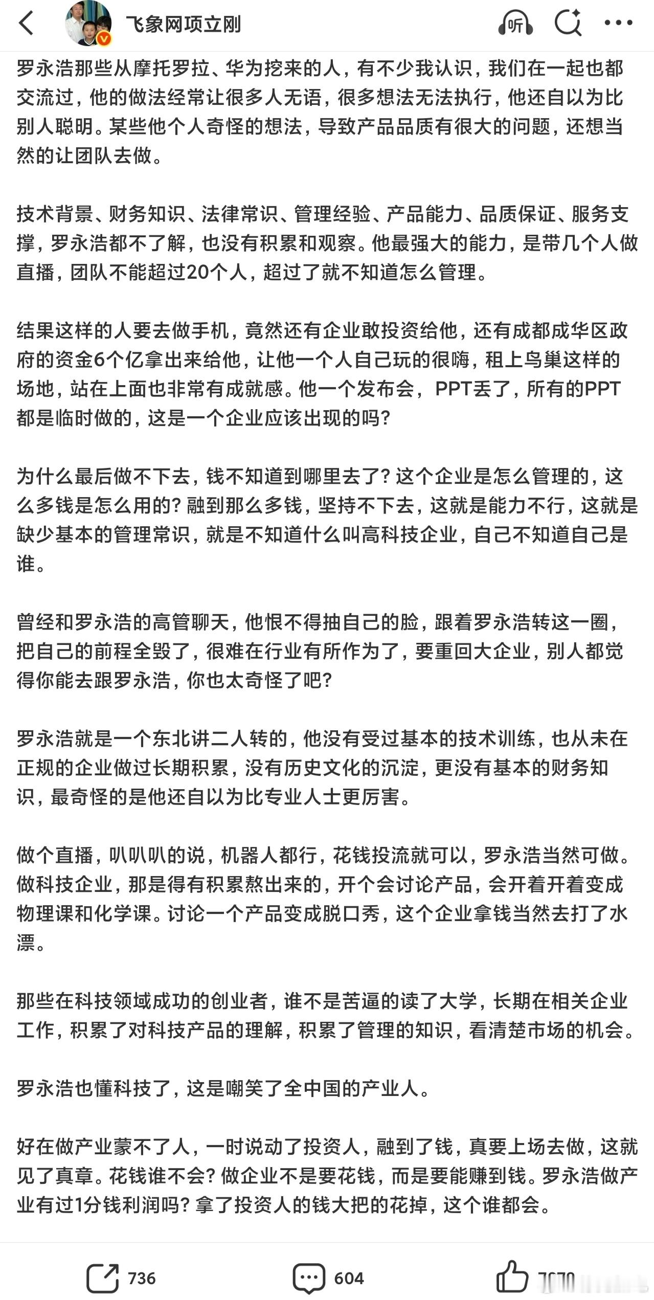 黏上了,是不是老年人会有点玻璃心,项立刚今年59岁,罗永浩今年53岁,罗永浩骂了一句项立刚智障,然后项立刚接连几天连续输出,从民族大义,谈到感恩之情,再谈到知识积累,罗永浩给人的感觉就是个不学无术,刚愎自用。真应了那句话,成了就是高瞻远瞩能说会道,败了就是油嘴滑舌好高骛远。第一篇搬出华为背书,第二篇搬出新东方,第三篇搬出小米对比,实在是高!罗永浩估计最近在忙科技春晚的事,没回项立刚,这是罗永浩生平第一次这么憋屈,跟个缩头乌龟一样吧?他可是从无败绩呀!估计项立刚还有几篇会让罗永浩坐不住,但凡是个人都受不了,太粘人了。