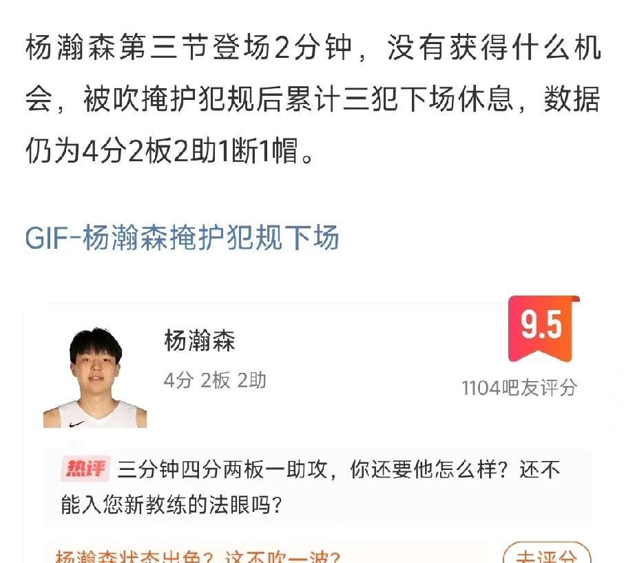 这数据还不行吗?就给这几分钟!是斯普利特的意思还是管理层的意思? 开拓者主场迎战魔术的比赛,比赛已经结束开拓者106:110输给魔术,杨瀚森出场8分钟拿下4分2板2助攻1断1帽,罚球2中2,命中率100%,而且短短的几分钟填满了数据栏! 不管杨瀚森打成什么样,打的坏也就4分钟,打的好也就给7-8分钟,真不知道开拓者咋想的!除非是开拓者彻底摆烂,杨瀚森才有时间,否则这个情况,开拓者还想要战绩,还想锻炼杨瀚森到最后就是样样不行!