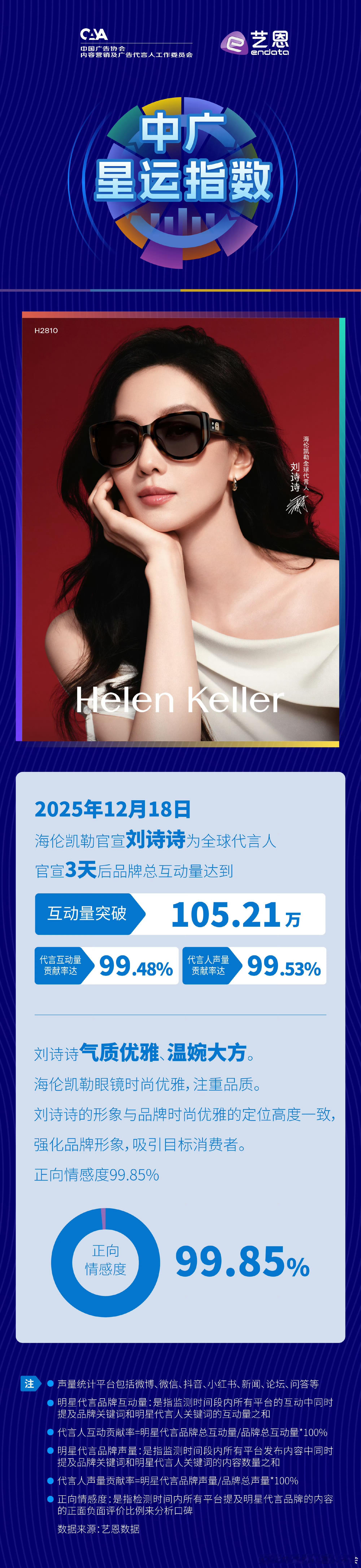 【中广星运指数】12月18日,官宣为全球代言人。官宣三天后品牌总互动量105.21万,代言人声量贡献率99.53%,代言互动量贡献率99.48%,正向情感度99.85%。刘诗诗气质优雅、温婉大方。海伦凯勒眼镜时尚优雅,注重品质。刘诗诗的形象与品牌时尚优雅的定位高度一致,强化品牌形象,吸引目标消费者。 刘诗诗海伦凯勒全球代言人