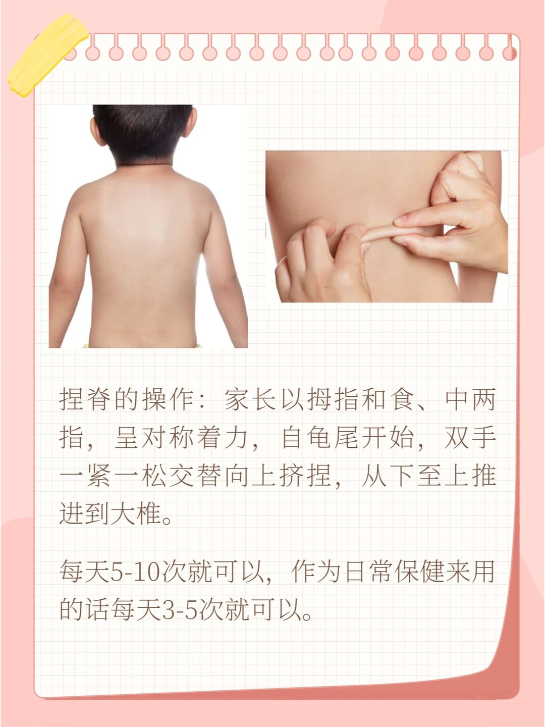 说到小儿推拿手法,最让家长朋友熟知的,非捏脊莫属了。 捏脊部位是在孩子的背部,后背为☀,督脉是“☀脉之海”,捏拿脊背可调节全身的☀气,同时呢,通过手法的刺激,还会直接刺激人体脊背部经穴,调节阴阳平衡,达到改善脏腑的结果。 所以,日常给孩子捏捏脊是一种很好的强身健体的方法。 🎀具体操作手法为: 家长以拇指和食中两指,呈对称着力,自龟尾开始,双手一紧一松交替向上挤捏,从下至上推进到大椎。 作为日常保健来用的话,每天做3~5次即可。