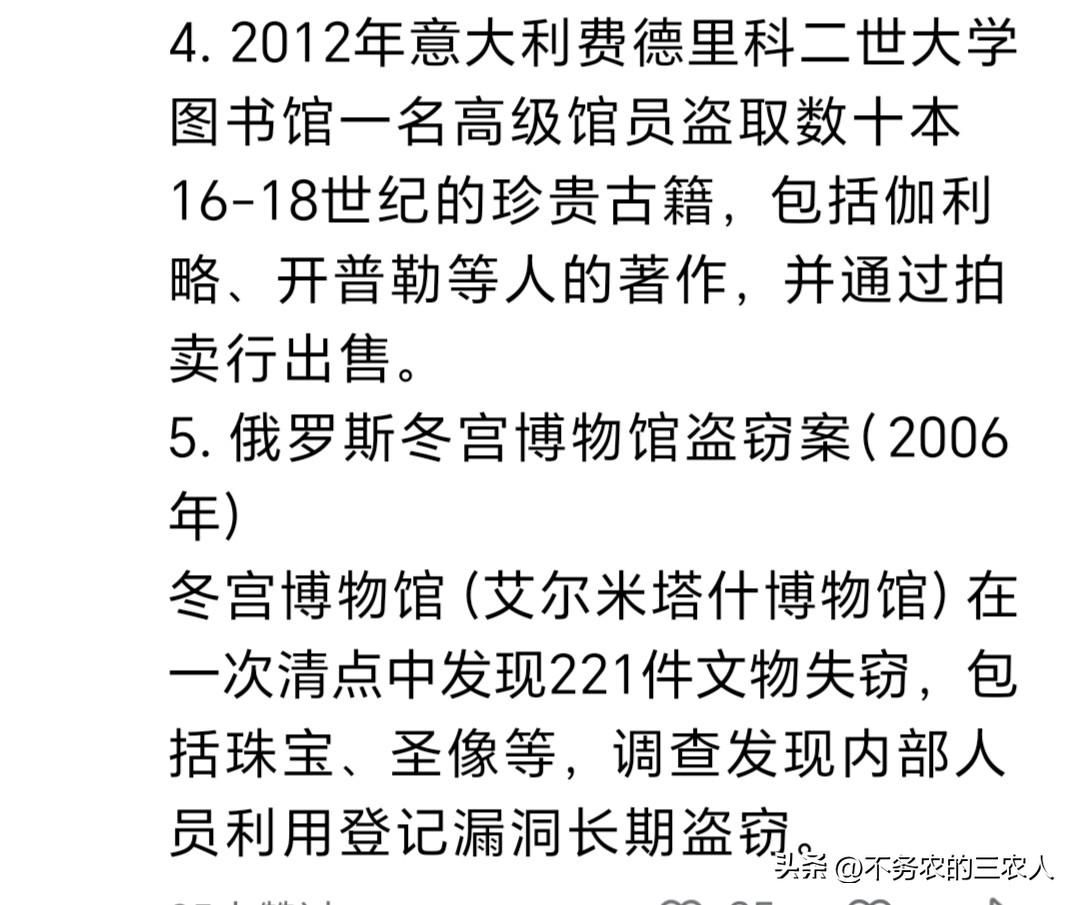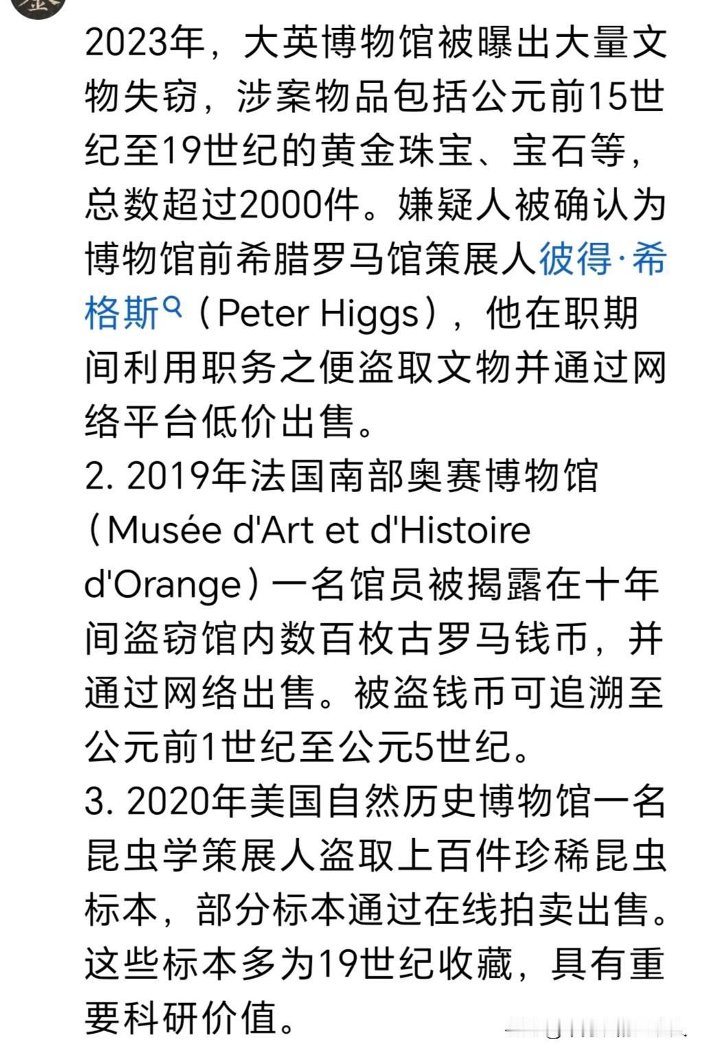 不建议因南京博物馆事件,就将所有公立博物馆全盘否定,说什么“以后没人会再向博物馆捐献文物,有文物也会捐给外国”这类传导负面价值观的话。 有问题就解决问题,上级已针对南博事件派出调查组,相信很快会给大家一个交代,相关责任人也会受到惩处。 况且,博物馆监守自盗并非我们独有的问题。下面图中简单列举了英、美、法、意及俄罗斯的几家博物馆存在类似情况的例子。 当然,我并非说别国存在此类现象,我们就理应如此,只是想告诉大家,别一遇到本国出点状况,就觉得他国比我们做得好。