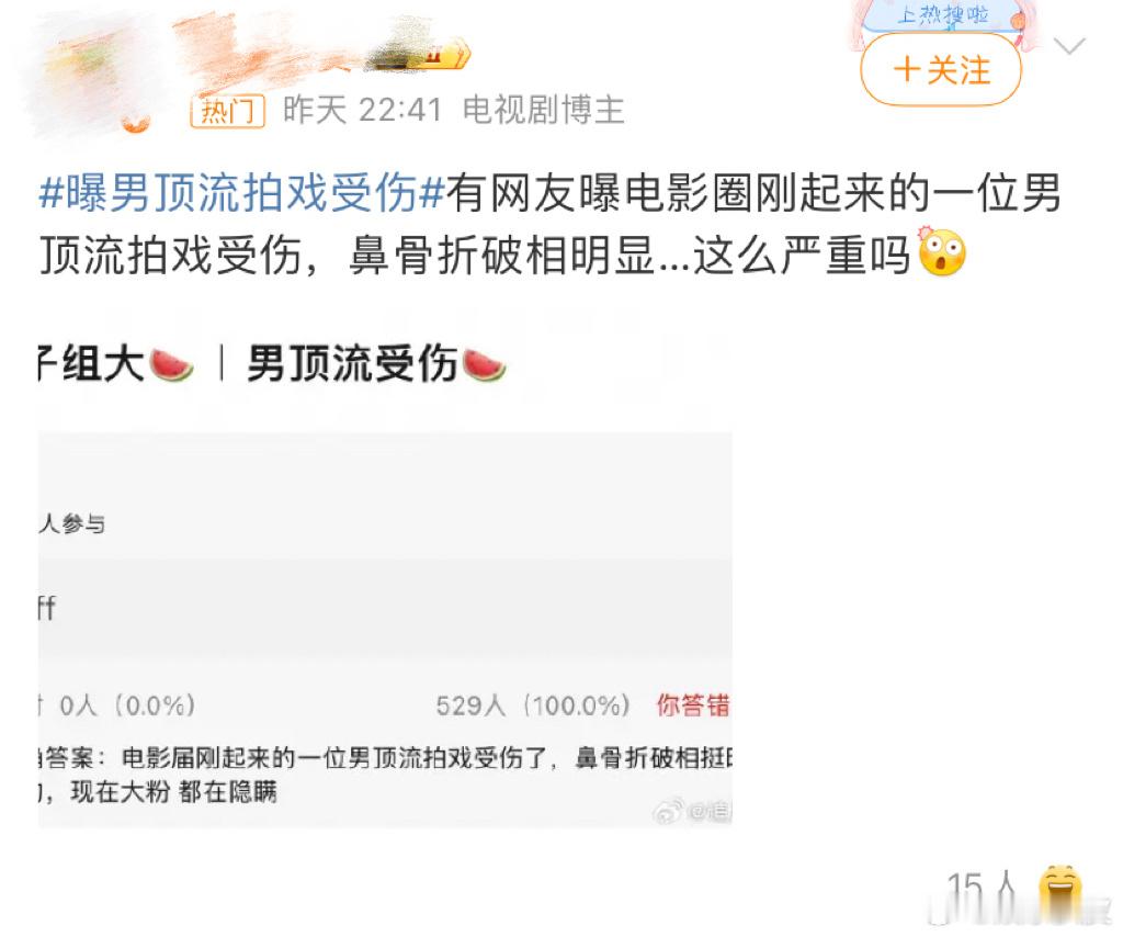 有瓜组曝男顶流拍戏鼻骨折,希望不是真的,大家拍戏注意安全,剧组一切顺利。