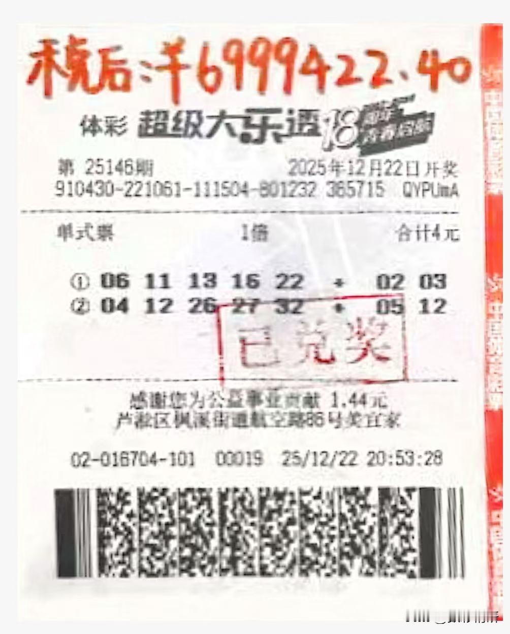 看湘超助力一等奖,大乐透第25146期湖南株洲彩民王先生(化姓)于23日现身省体彩中心,喜提874万元一等奖,税后近700万。 据王先生讲述,这份天降鸿运竟源自一场酣畅淋漓的湘超球赛——上周六在株洲观赛时,他获赠了两张大乐透彩票,巧合的是,这两张彩票的后区号码均为“02+03”。 更令人称奇的是,22日途经投注站时,他首次机选后犹豫片刻决定更换号码,而第二次机选的后区竟再次开出熟悉的“02+03”,正是这一念之差与数字的奇妙呼应,最终锁定了这注一等奖。这真是太神奇了,你们觉得呢?