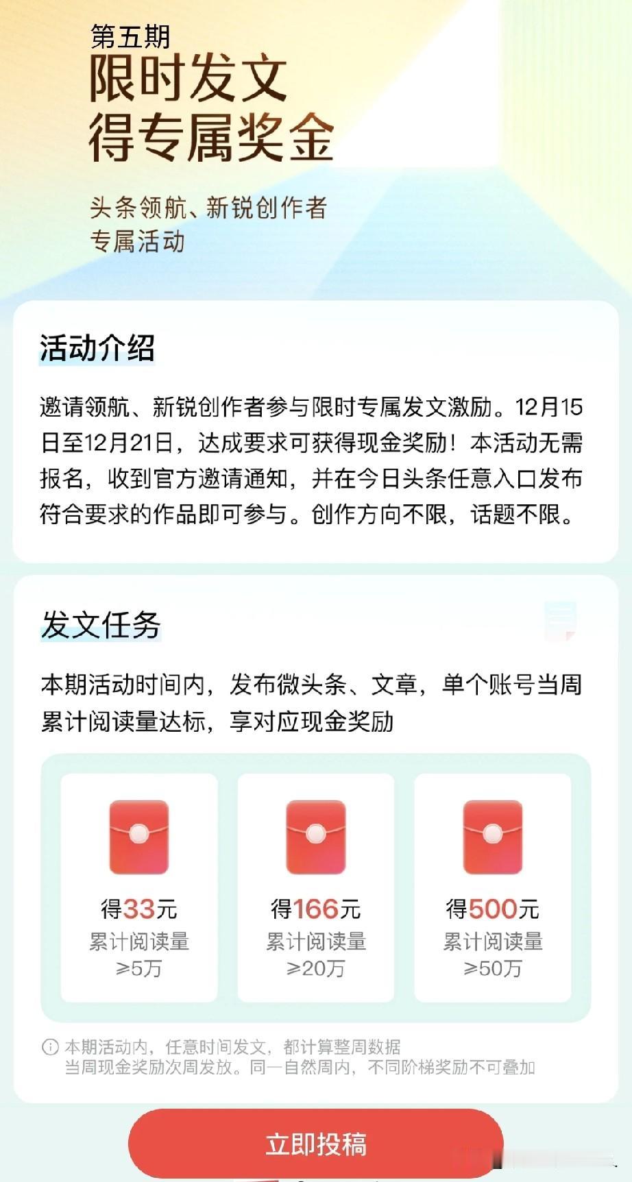 弱弱问一下各位新锐创作者,上周(14 - 21日)的新锐专属奖金发了吗? 我记得上上周奖金是周二发的,今天都周四了还没发,不会其他人都发了,单单把我漏掉了吧? 我上周总阅读量达到34万,超过了第二等级要求的20万阅读量,按奖励规则,能得166元奖励。 这周没收到活动通知,是不是意味着参加不了了啊?