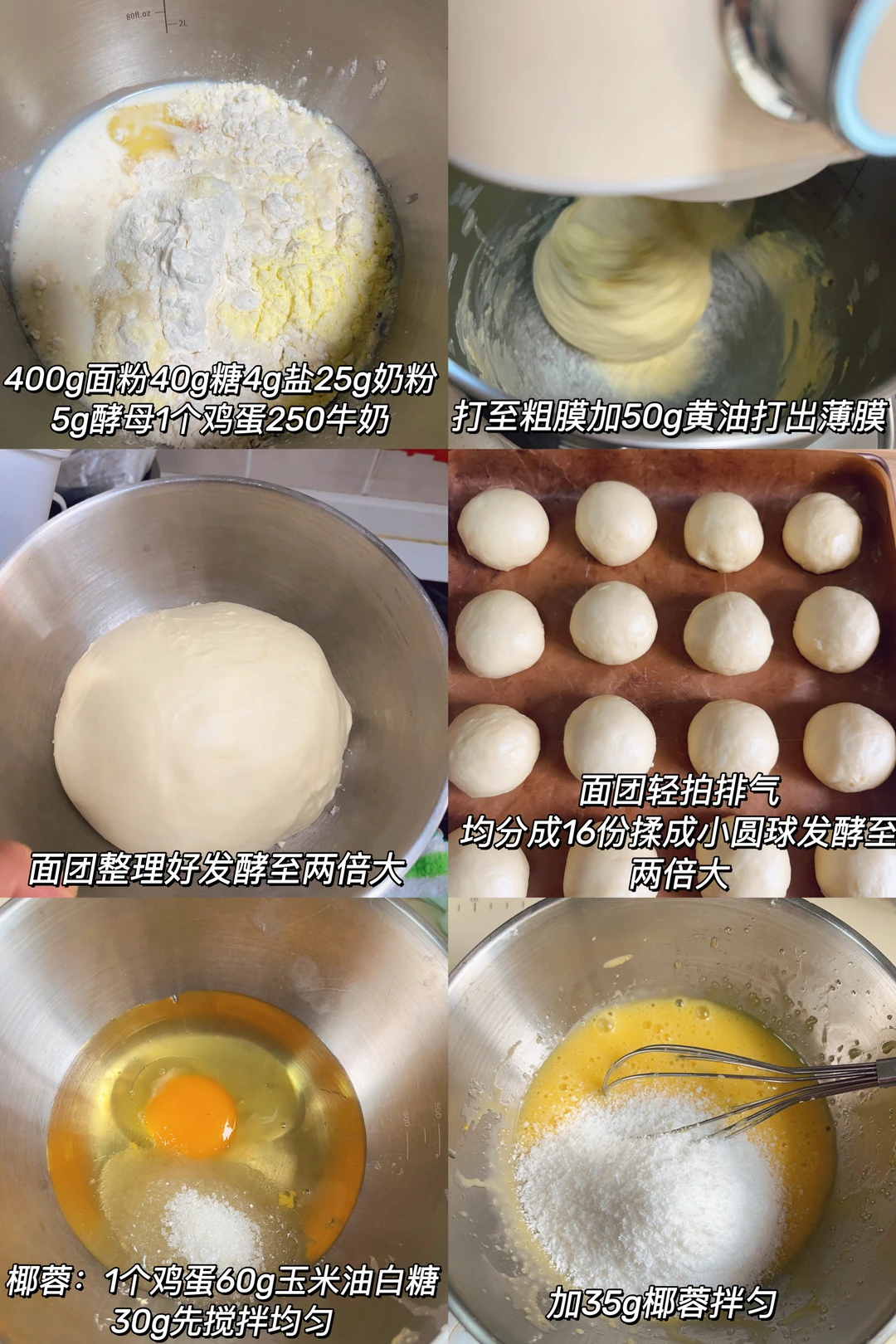 面团:400g高筋面粉、40g糖、4g耐高糖酵母、4g盐、25g奶粉、1个鸡蛋、250g牛奶、50g黄油