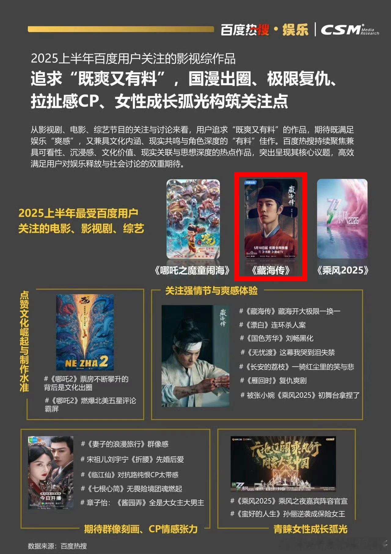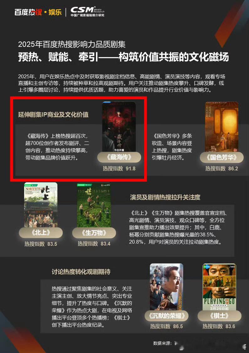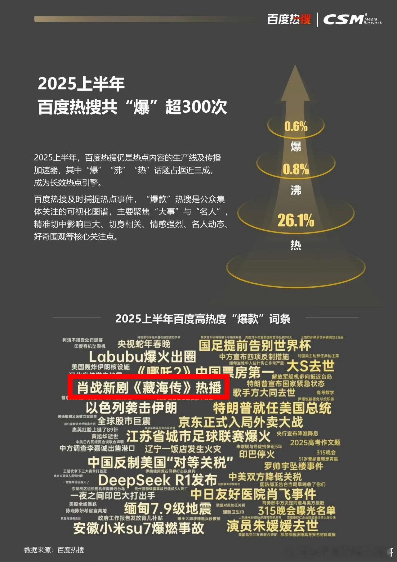 百度影响力2025年终报告,肖战作为唯一一位演员,凭借火爆作品【藏海传】和【得闲谨制】,国民度和影响力强力提升,立于封面。 无论是年中还是年底总结,肖战和藏海传都被百度认证为热度第一大爆剧和演员!