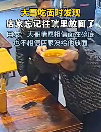 老板,我的碗里为什么只有汤没有面? 笑死我了,12月18日,四川一男子在餐馆准备吃面,他对着满满一碗红油汤,先是用筷子戳了又戳,发现一根面条都没有。 最后这位大哥竟然把碗端起来,想看看面条是不是藏在碗底。 哈哈,太有喜剧感了! 大哥:老板,我的面在哪?碗里没有,碗底也没有啊!哈哈!饭店吃面 四川面馆 社会百态