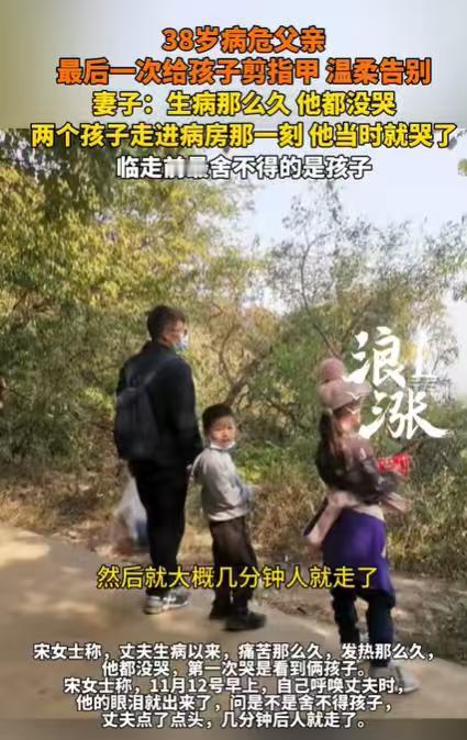 都说男儿有泪不轻弹,河北的这位父亲被病痛折磨了这么久,硬是没掉一滴眼泪。 但是当他看到自己的两个孩子时,眼泪立马就留下来了。 38岁的他,在生命的最后几分钟,做了一件很小的事:给孩子剪指甲。 或许,那时候的他已经手抖得特别厉害;或许,那时候的他已经握不稳剪指甲刀。 但是我觉得他一定剪得特别仔细,特别认真。几分钟后,他便安静地走了。 这就是父亲吧,能默默忍受所有病痛,却扛不住对孩子的不舍,对家人的不舍。即使是在生命的最后时刻,都还在想着能为你做点什么。 珍惜眼前人!社会百态 爸爸 父爱