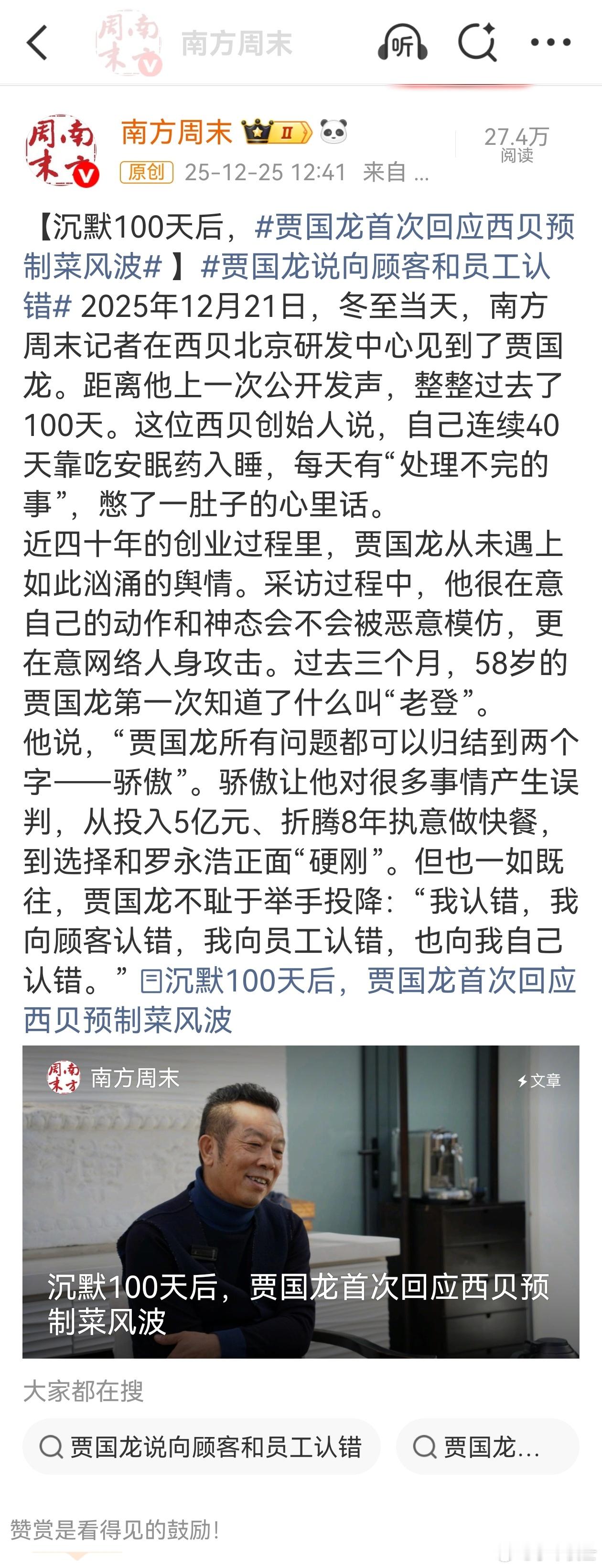 贾国龙首次回应西贝预制菜风波 通篇看完了《南方周末》对西贝老板贾国龙的专访,我觉得挺有意思。跟大家分享一下重点:【南方周末】:现在你发现自己犯了哪些错误?【贾国龙】:第一个错误是选择正面硬刚,说我宁愿不做生意,也要辨明是非,一定要起诉罗永浩;第二个错误是开放厨房;第三个错误是我在一个微信群聊里发言,回应同行关心,用了“网络黑社会”的说法。归根结底,都是因为冲动。还有一个更大的错误,是我长期忽视了顾客的声音。【南方周末】:如果能重来,你会怎么做?【贾国龙】:坚决不硬刚,耐心听每一个顾客的意见。吵架得两个人吵,你不吵,也吵不起来。以后我也不再做个人IP,退回来认真干活。在管理企业方面,我还是有心得、有兴趣。好好把菜做好、服务好顾客,这才是我擅长的。【南方周末】:之前也有很多人给过你建议,以后你会“听劝”吗?【贾国龙】:人都是吃一堑长一智,未来不能再独断专行。这件事让我意识到了自己的幼稚和无知。【南方周末】:为什么大众理解的预制菜和你理解的不一样?【贾国龙】:按国家之前公布的定义,中央厨房预加工食品、主食、原材料预加工都不算预制菜,那么西贝门店里的都不算预制菜,但是,我确实不该用这一定义去对抗公众认知。 贾国龙说向顾客和员工认错子午评论 :个人觉得,贾国龙以上言论是发自肺腑的,是真诚的,一个拥有几百家门店,近两万员工的知名餐饮界大佬,能公开自省,反思自己,我认为实属不易,难能可贵。特别值得肯定和赞许的是,西贝陷入由罗永浩引起的预制菜风波之后,在西贝生意萧条,门前冷落,亏损数亿,在西贝最艰难的至暗时刻,贾国龙非但没有给员工降薪,反而给每位员工加薪了500元,这一点,让人不仅敬佩,简直都有点吃惊。一家企业,对员工怎么样,这家企业便怎么样,对员工好,那么这家企业就一定好,而且会越来越好,我想这个逻辑,大家都明白,也都能理解。我本人这几个月特意多次到西贝用餐,就是想了解西贝到底怎么样,也和西贝的店长、服务员,进行过交流,我发现西贝的员工,一提起贾国龙,都是非常敬佩的,同时,也都对西贝的未来充满了信心。看样子目前西贝已经从低潮中走出来了,作为西贝风波的见证者,也作为一个西贝的消费者,我很欣慰,也真心希望西贝能再创辉煌。有时候想起来,真为西贝的遭遇愤愤不平,一个好好的企业,一个没有任何违规违法的企业,竟然被一个网络混混,一个网络泼皮,整得险些倒闭,这还是法治社会吗?希望保护民营企业,保护合法经营的民营企业,保护遵纪守法的企业家,不要停留在口头上,要拿出行动,对于网络黑嘴,要坚决打击,坚决惩治!