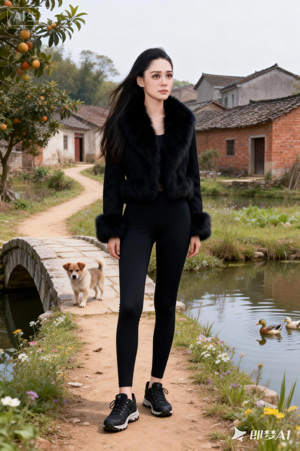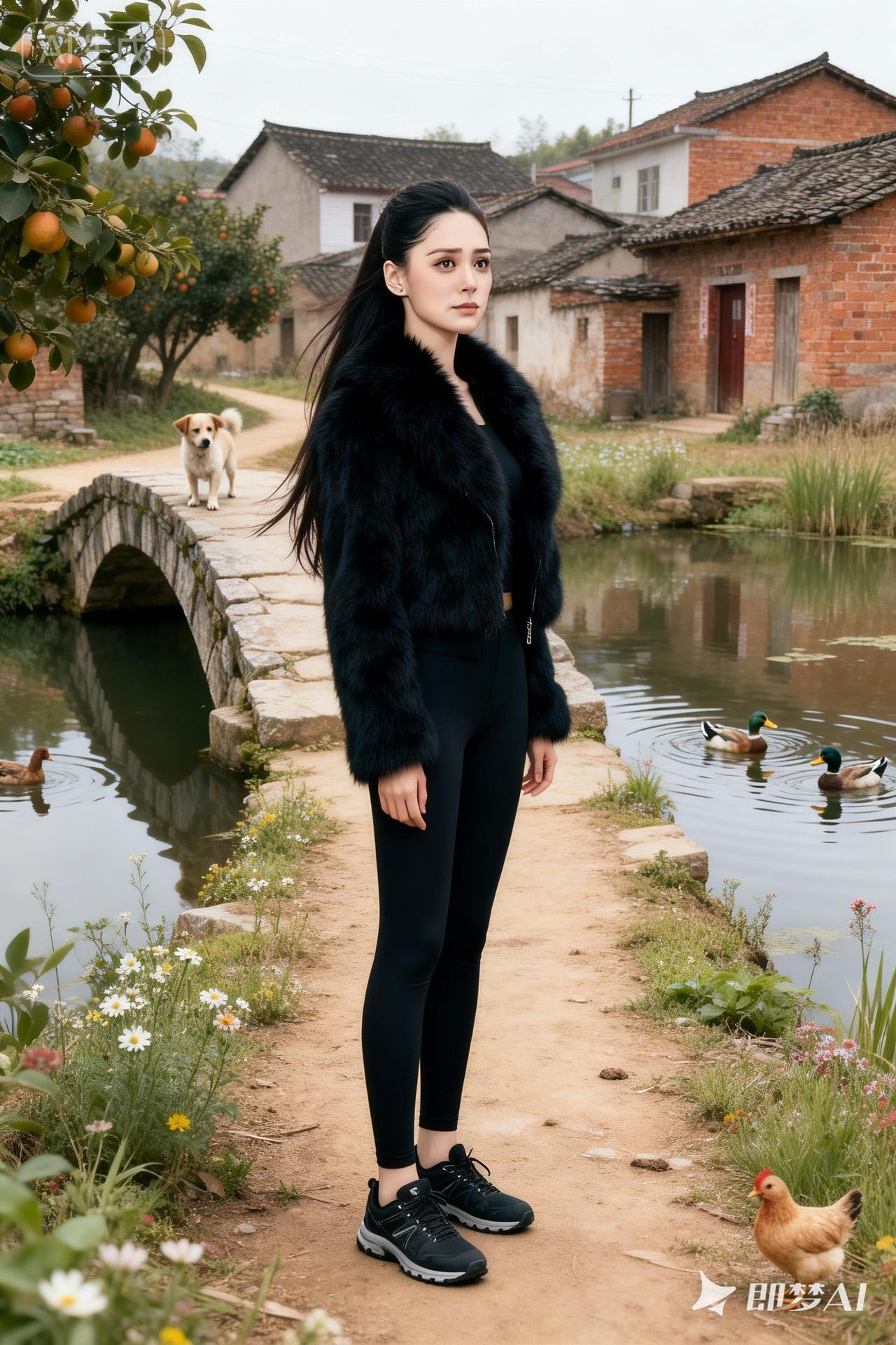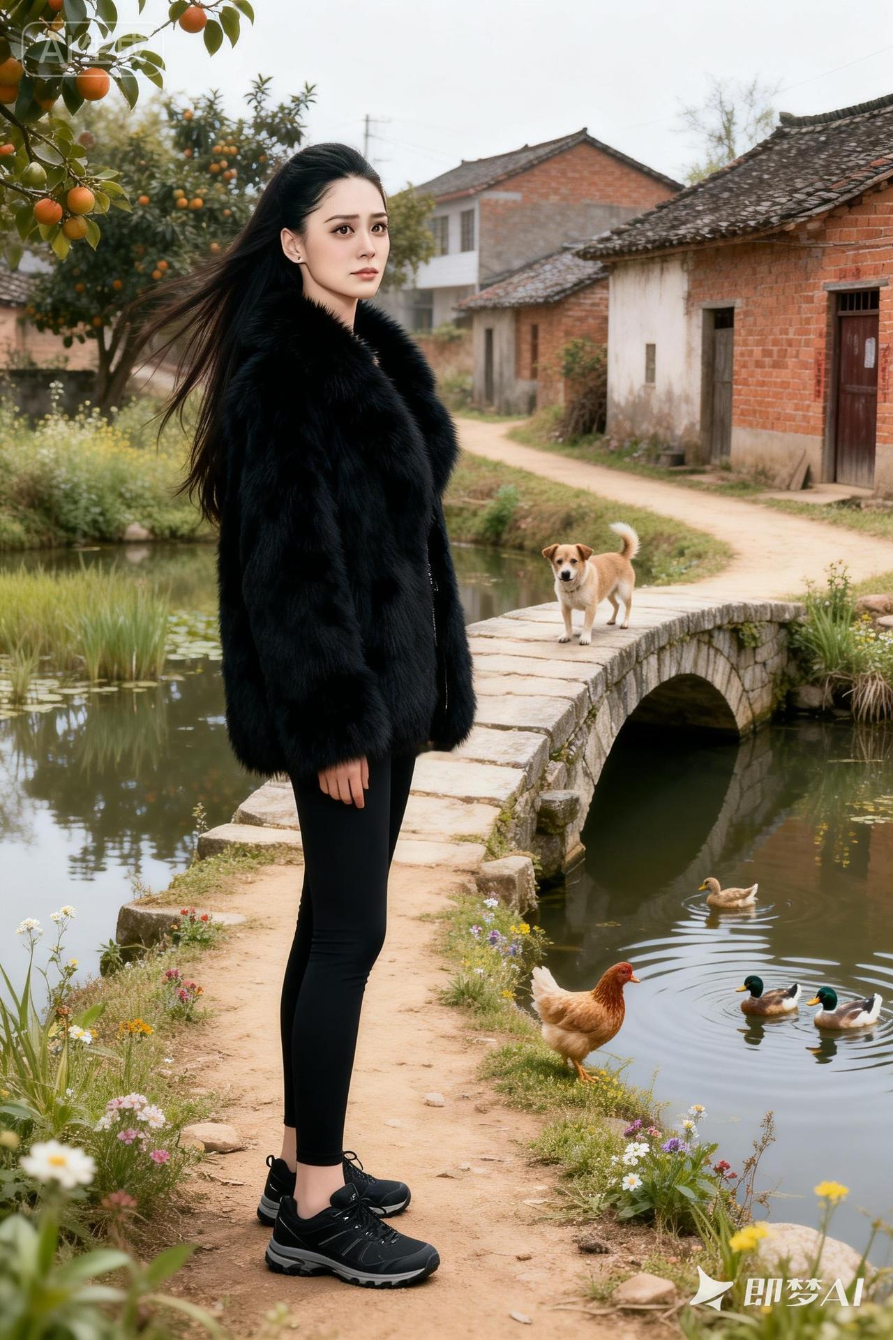 冬日暖阳下,黑衣少女与乡村小桥的静谧时光。