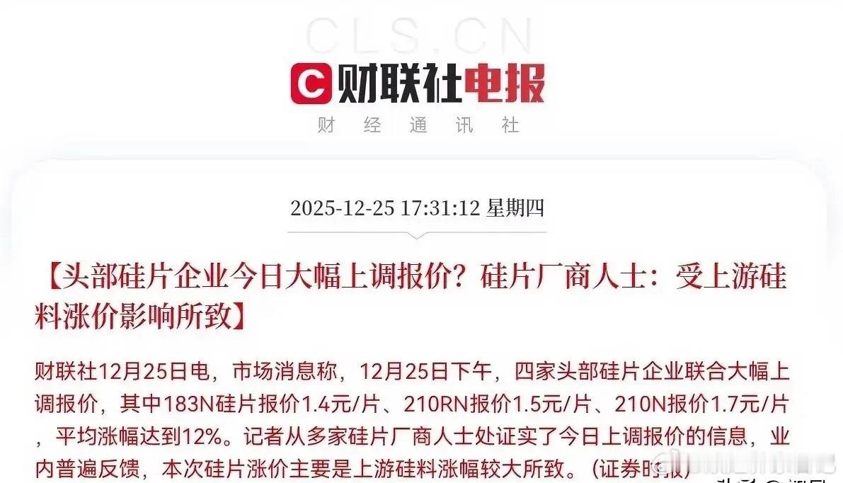盘后重磅利好!头部硅片企业联合涨价12%,光伏产业链红利释放,20只核心受益股全梳理12月25日财联社重磅消息,四家头部硅片企业同步大幅上调报价,183N、210RN、210N硅片报价分别涨至1.4元/片、1.5元/片、1.7元/片,平均涨幅达12%,且该调价信息已获厂商证实。此次涨价核心源于上游硅料价格大幅走高,光伏硅片产业链价格传导效应将逐步落地,全产业链相关企业迎来明确利好,盈利弹性清晰可见!此次硅片集体涨价,绝非单一企业行为,头部厂商联手调价尽显行业话语权,涨价红利将沿产业链层层传导:上游硅料企业坐享涨价核心驱动红利,中游硅片厂商直接兑现价格上涨的利润增厚,下游一体化企业可通过调价传导成本,配套设备与辅材企业则随行业扩产间接受益,其中硅片、硅料两大环节盈利弹性最为突出。光伏硅片涨价核心受益股全名单(20只核心标的)1. 隆基绿能:全球单晶硅片龙头,183/210大尺寸硅片产能行业领先,大尺寸产品结构占优,涨价直接增厚硅片利润,组件业务亦可传导成本压力。2. TCL中环:210N型大尺寸硅片产能领跑行业,涨价后产品溢价力凸显,叠加自有硅料布局对冲成本,硅片业务盈利弹性拉满。3. 上机数控:单晶硅片产能靠前,布局工业硅+硅料实现产业链延伸,涨价带动硅片营收增长,一体化布局助力降本增效。4. 通威股份:硅料龙头兼营硅片、电池业务,上游硅料涨价是本次调价核心动因,硅料、硅片双业务同步受益,业绩确定性拉满。5. 大全能源:国内高纯多晶硅核心生产商,硅料涨价的核心受益者,产能持续释放叠加价格上行,业绩增长底气十足。6. 晶科能源:光伏一体化龙头,硅片自供且对外销售,涨价提振硅片盈利,叠加组件出货量攀升,整体业绩稳步改善。7. 晶澳科技:硅片-电池-组件全产业链布局,硅片涨价直接获利,组件端调价传导成本,全产业链优势保障盈利稳定。8. 双良节能:硅片赛道后起之秀,单晶硅片产能持续爬坡,大尺寸产品竞争力提升,涨价加速硅片业务盈利兑现。9. 京运通:覆盖硅片、硅料、光伏电站多环节,硅片产能稳步扩张,大尺寸占比提升,涨价直接拉动硅片营收增长。10. 高测股份:光伏切割设备龙头,同步布局硅片切割代工与硅片生产,涨价带动行业扩产,设备+代工双业务双重受益。11. 阳光电源:光伏逆变器龙头,硅片涨价推升行业景气度,电站配套需求增长带动逆变器出货,储能业务协同发力。12. 福斯特:全球光伏胶膜龙头,硅片涨价带动光伏装机需求增长,胶膜作为核心辅材需求同步放量,高市占率锁定收益。13. 福莱特:光伏玻璃龙头,组件出货预期向好带动玻璃需求增加,产能扩张叠加价格稳定,盈利支撑强劲。14. 爱旭股份:光伏电池龙头,TOPCon技术优势显著,硅片涨价成本可通过电池调价传导,产品溢价保障盈利韧性。15. 钧达股份:手握TOPCon电池核心产能,布局硅片业务形成协同,涨价增厚硅片收益,技术优势助力成本顺利传导,业绩弹性十足。16. 东方日升:光伏全产业链一体化布局,硅片涨价利好环节收益,海外成熟渠道推动组件出货、盈利双增长。17. 协鑫集成:组件龙头兼营硅片业务,硅片涨价提振环节盈利,组件端优化产品结构传导成本,海外渠道助力出货放量。18. 汉钟精机:光伏硅片生产专用真空泵核心供应商,行业扩产带动设备需求提升,光伏设备业务营收、利润双增。19. 精功科技:主营硅片切割设备、多晶硅铸锭炉,硅片企业扩产潮下,光伏专用设备订单有望大增,迎来发展机遇。20. 锦富技术:布局光伏硅片切割辅料业务,行业扩产驱动辅料需求增加,业务规模有望持续扩容。核心总结:抓准两大核心,把握产业链红利本次硅片涨价由硅料涨价驱动,头部企业联合调价筑牢行业盈利底线,硅片、硅料环节是本次涨价的最大赢家,盈利弹性最为突出;具备硅片-电池-组件全产业链布局的企业,可更好平衡成本与收益,盈利稳定性更优。此外,光伏设备、辅材企业将伴随行业扩产迎来需求增量,属于间接受益的优质赛道。后续可重点跟踪硅料价格走势与光伏装机需求落地情况,精准把握产业链各环节的盈利兑现节奏。