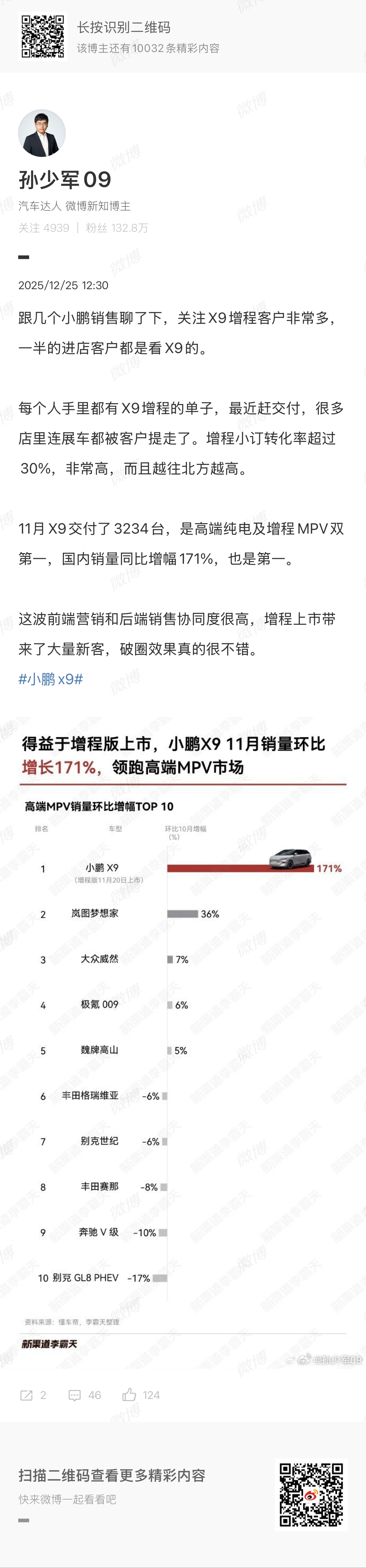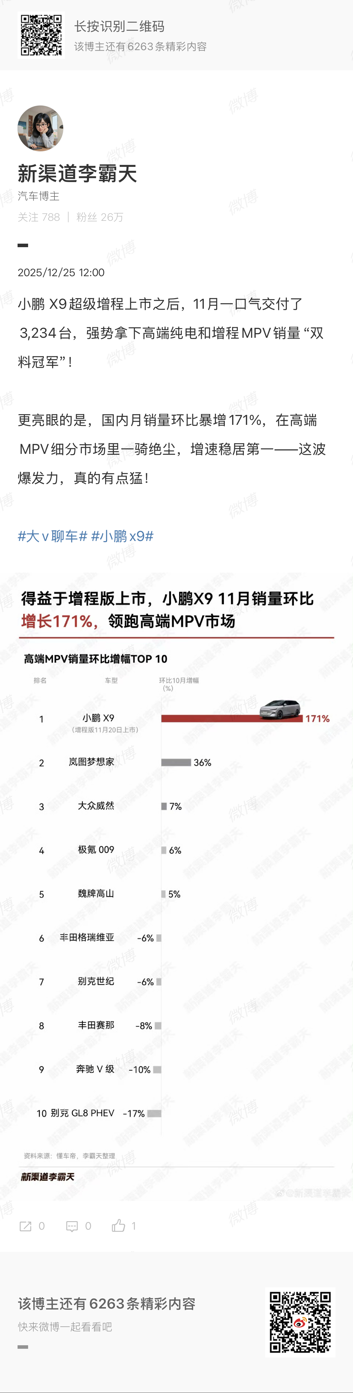 小鹏X9登顶11月高端纯电及增程MPV双第一真正的爆款从不是靠营销造势,而是精准击中用户核心诉求后的水到渠成。小鹏X9超级增程11月交出的成绩单,恰好印证了这一点。登顶高端纯电及增程MPV双料冠军,171%的环比增幅领跑同级,门店半数客流专为它而来,北方市场转化率居高不下,甚至出现展车被抢购的火爆场景,这份热度背后,是产品力的扎实支撑。作为家用大七座MPV,小鹏X9超级增程最核心的突破,是解决了用户的核心痛点。1602km CLTC综合续航搭配452km纯电续航,再加上800V高压平台5C超快充,彻底打消了长途出行的续航焦虑,这也是它在北方市场受欢迎的关键;3160mm超长轴距带来的舒展空间,让第三排也能实现180°躺平,三排电动三折叠设计更让空间灵活适配多元场景,满座也不牺牲储物能力。11月小鹏X9销量环比增幅171%同级第一从安全到体验都做到了无明显短板。30.98万起的定价,将这些越级配置落到了更多家庭触手可及的区间,也让“智能+实用”成为高端MPV的新标杆。市场从不缺选择,但能把续航、空间、舒适、安全做到均衡且出色的产品,自然会被用户用脚投票。小鹏X9超级增程的热销,或许也为MPV市场的发展,提供了一个清晰的答案:回归用户真实需求,才是长久之道。