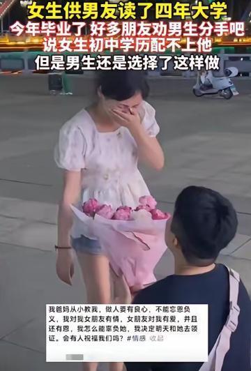 湖南,一男孩考上大学却没钱去读,没想到女友叫他别放弃,她打工供他读书,4年后,男孩毕业了,并且有一份不错的工作,他的朋友都说初中学历的女友配不上他,劝他分手!但是男孩的一个决定让女友泪流满面。网友:这才是真爱! 东莞的冬夜,寒风卷着沙尘刮过电子厂围墙。 陈燕裹紧那件洗得发白的旧外套,刚结束12小时的夜班,手指上的创可贴被汗水浸透,黏在磨破的伤口上。 口袋里的手机震动了一下,是李伟发来的消息,说自己拿到了奖学金,还为她买了护肤品已经寄出。 省城大学的图书馆里,李伟盯着手机屏幕笑了笑,把手机揣回口袋,继续低头演算真题。 桌角放着半块没吃完的馒头,是他的晚餐。 为了省钱,也为了多挤出时间学习,他很少去食堂吃热乎饭。窗外的月光洒在书页上,映出他专注的侧脸。 酒桌上,同事的话语带着几分戏谑,暗指已是国企白领的李伟不该还和电子厂女工处对象。 李伟猛地放下酒杯,脸色沉了下来,周身的气场瞬间冷了下去。 在他心里,这个女孩从不是旁人眼中普通的电子厂女工,自己今天拥有的一切,全是她用血汗换来的,这份恩情与情意,远比所谓的身份匹配更重要。 周围的喧闹因他的沉默瞬间安静,没人明白这句话背后藏着多少血汗。 四年前拿到录取通知书的那天,湖南娄底的农村烈日灼灼。 李伟蹲在院子里的老槐树下,手里的通知书被攥得发皱。 父亲卧病在床的呻吟从屋里传来,母亲坐在门槛上抹眼泪,三亩薄田的收成连药费都不够,更别提几千块的学费,上学的希望在现实面前显得格外渺茫。 李伟默默站起身,眼底满是绝望,已然做好了放弃学业外出打工的决定。 就在这时,身后传来急促的脚步声,16岁的陈燕背着打工用的行李包,额头上还带着赶路的汗珠,快步走到他面前,从口袋里掏出一沓捆得整整齐齐的钱,里面既有百元大钞,也有零碎硬币,那是她全部的积蓄,一共八千三百块,执意要让李伟拿去交学费。 李伟的眼眶瞬间红了,攥着钱的手微微发抖,反复推着不肯接受这份沉甸甸的馈赠,他清楚这每一分钱都是陈燕在流水线上熬出来的血汗钱。 陈燕却态度坚决,把钱往他怀里一塞就转身离开,用决绝的背影传递着自己的心意——如果李伟放弃上学,她便再也不回这个村,以此逼他珍惜求学的机会。 电子厂的流水线旁,陈燕盯着高温的电路板,手里的焊枪不停移动。 手指被烫出泡,她咬着牙缠上创可贴继续干。 为了多挣加班费,她主动申请上夜班,从晚上十点到早上六点,熬得眼睛布满血丝,回到宿舍倒头就能睡着。 电话接通后,陈燕的声音沙哑得厉害,字里行间满是自卑与退缩,隐晦地表达了想要分开的想法,觉得自己配不上如今事业有成的李伟。 刚结束应酬的李伟站在路灯下,寒风刮得他脸颊生疼,手里的手机几乎被攥碎,满心都是焦急与心疼,只想立刻飞到女孩身边安抚她的情绪。 那年冬天,李伟收到一个沉甸甸的包裹,里面是一件厚实的棉袄。 他穿上棉袄,暖得直想哭,后来从同乡口中才知道,陈燕为了买这件棉袄,省吃俭用攒了两个月,自己冬天就靠那件薄外套扛着,冻得感冒发烧还硬撑着上班,一句苦都没说。 陈燕的饭缸里,是从菜市场捡来的剩菜叶煮的汤,配着一个冷馒头。 每月发工资,她第一时间给李伟汇款,自己只留500块生活费,连五十块的衣服都舍不得买。 可给李伟寄钱时,她从来没含糊过,总怕他在学校受委屈。 李伟攥着手机,转身就往火车站跑。他请了年假,用第一个月的工资买了一枚戒指,还有一大束陈燕最喜欢的向日葵。 四年了,他欠这个女孩一场郑重的告白,欠她一个安稳的未来。 电子厂下班的人流中,陈燕穿着工装,一脸疲惫地走着。 突然,她看到了站在不远处的李伟,手里捧着向日葵,笑容温柔。 周围的工友渐渐围了过来,李伟快步走上前,单膝跪地,举起了戒指。 李伟单膝跪地,声音哽咽却无比坚定,目光紧紧锁住陈燕。 他细细诉说着这四年里她的辛苦付出,坦言没有她就没有今天的自己,所谓的配不上从来都是旁人的偏见,在他心里,是自己亏欠她太多。 他承诺以后换自己来照顾她,会带她报成人高考一起进步,用一枚戒指传递着想要共度余生的心意。 陈燕站在原地,愣了几秒钟,眼泪瞬间涌了出来,顺着脸颊往下掉。 她浑身发抖着点头,说不出一句话。周围的掌声此起彼伏,有人喊“嫁给他”,有人跟着抹眼泪。 阳光穿过人群,照在两人身上,也照在那束金灿灿的向日葵上。 就像河南的张强和刘敏,当年张强考上大学因母亲重病没钱读,刘敏辍学打工供他,后来张强毕业当众求婚,支持她自考。 这些散落在时光里的故事,都在诉说着最纯粹的真情。 爱情从不是学历身份的匹配,而是你难时我托举,我好时我回头,用血汗浇灌的时光,终会开出最美的花。 如果各位看官老爷们已经选择阅读了此文,麻烦您点一下关注,既方便您进行讨论和分享,又能带来不一样的参与感,感谢各位看官老爷们的支持!