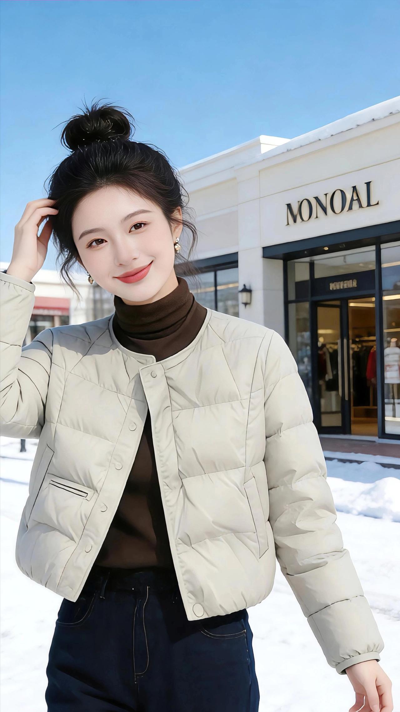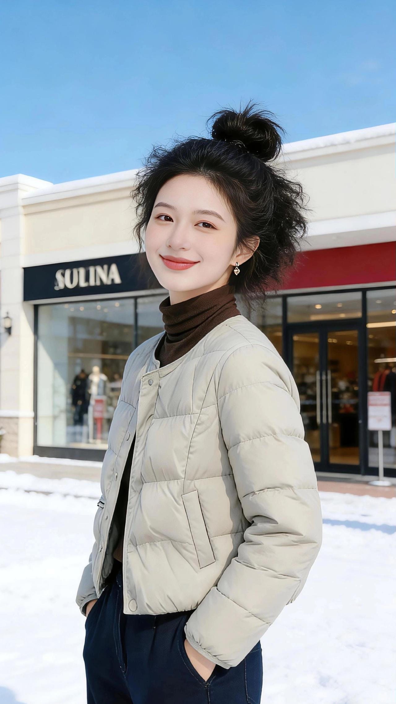 雪街行记 雪后的街区,像被蓝天衬得格外清亮。脚下的积雪踩出咯吱的软响,临街的店铺立在雪色里,玻璃橱窗映着晃眼的光,字母招牌在冬日的晴光里添了几分都市的温柔。 我裹着浅杏色的短款羽绒外套站在街边,软糯的面料裹着暖意,深棕高领内搭贴着脖颈,温温的。抬手拢了拢蓬松的丸子头,发梢的碎发被风拂起,与肩头的羽绒褶皱一同晃出慵懒的弧度。伸开手臂时,像拥住了这片雪天里的晴光,手指勾住衣摆轻扬的瞬间,凉意被羽绒的暖悉数隔在身外。 手插进口袋的那一刻,羽绒的软与裤子的挺括撞出别样的质感,望着街边覆雪的台阶,忽然觉得冬日的逛街时光,是裹着暖意的闲散美好。晴光落满肩头,雪粒在脚边闪着光,就这样慢悠悠走着,连风都成了温柔的伴。 高级感穿搭 小个子穿搭 冬季穿搭 棉衣棉服