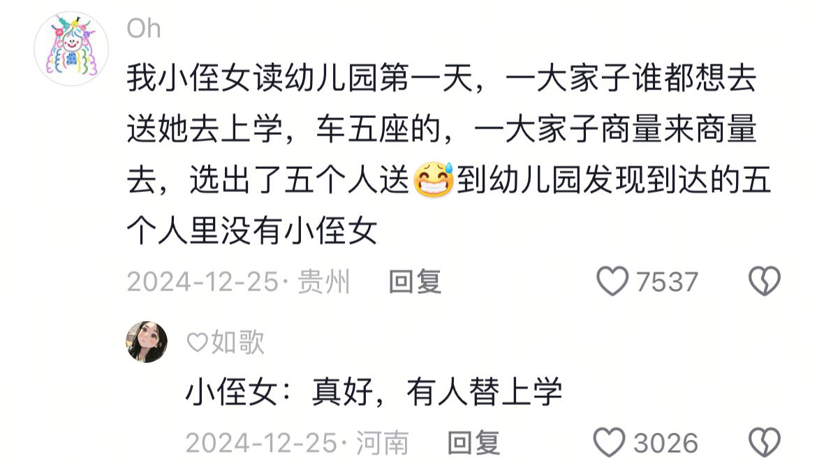 我小侄女读幼儿园第一天,一大家子谁都想去送她去上学,车五座的,一大家子商量来商量去,选出了五个人送色到幼儿园发现到达的五个人里没有小侄女