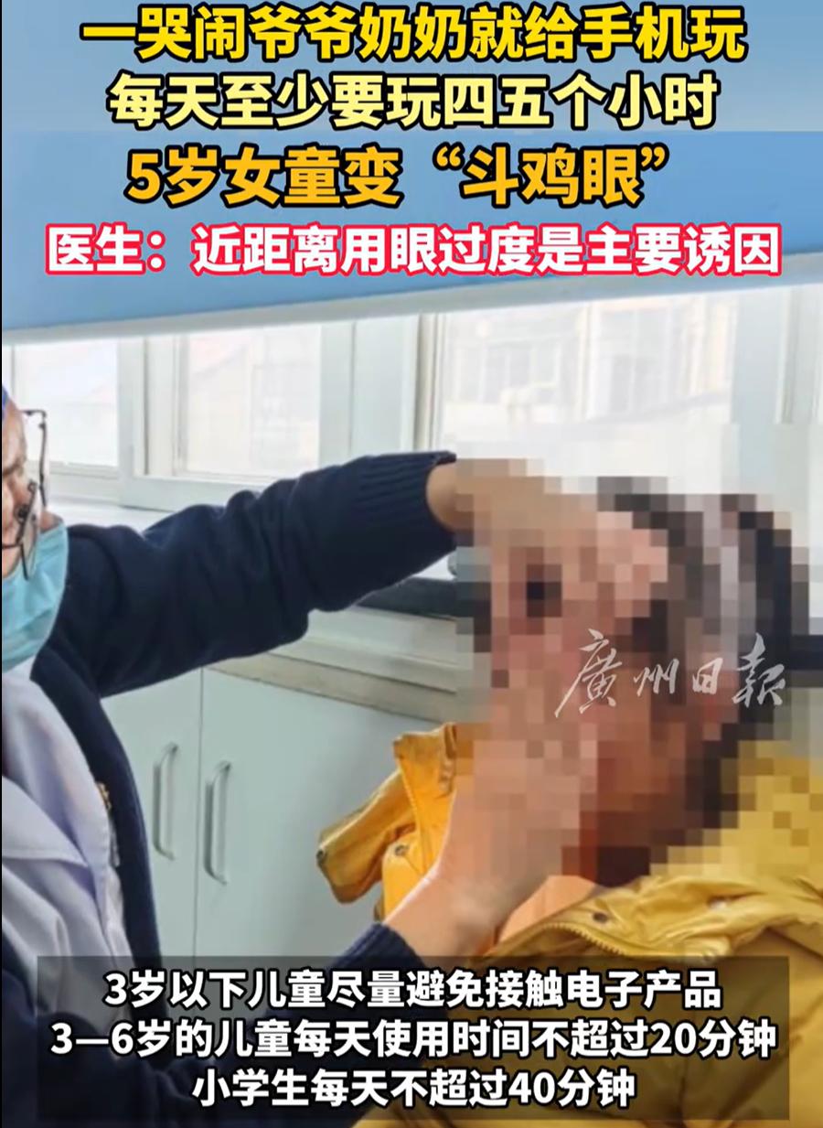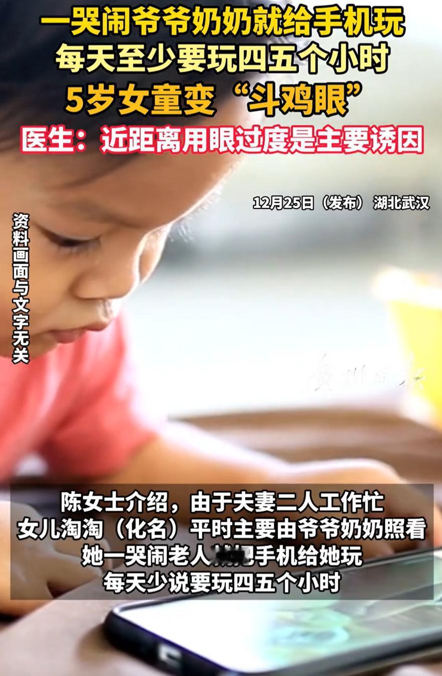 担心的事情还是发生了!湖北武汉,一对夫妻工作生活忙,就把五岁的女儿放到爷爷奶奶家去带,没成想,女儿却变成了“斗鸡眼”,后来一问才知道,只要孩子哭闹,老人就会递手机给孩子玩,结果玩出了问题 陈女士介绍,开始几周,女儿还挺适应,每周视频时都笑嘻嘻的。可最近两个月,女儿总在电话里说:“妈妈,我看东西有影子,一个变成两个。” 陈女士起初没太在意,以为孩子只是累了。直到周末去接孩子,她才发现不对劲,女儿的眼神明显往中间偏,看人时两只眼睛好像要对到一起了 她赶紧带孩子去了医院。检查结果出来,医生说是急性共同性内斜视,就是大家常说的斗鸡眼。仔细询问后,医生判断主要原因是孩子长时间近距离盯着小屏幕 陈女士一问爷爷奶奶才知道,这半年孩子养成了玩手机的习惯。老人说,孩子一哭闹怎么哄都不听,但只要把手机递过去,立马就安静了。后来这就成了“法宝”,孩子平均每天要玩四五个小时 很多人看到这类事,第一反应是指责老人带娃不专业,指责家长甩手掌柜。站在现实里看,这种局面并不稀奇 年轻人上班拼时间,老人带娃拼体力,中间那道沟,常常被一部手机草草填上。问题在于,手机对大人是工具,对孩子是持续高强度的近距离刺激。五岁的眼睛,发育还没稳定,长时间盯着屏幕,调节系统很容易被拖垮,斜视、视疲劳、重影就可能接连出现 不是手机有多可怕,也不是谁对谁错。手机本身不会追着孩子跑,是大人把它递过去的。带娃这件事,最容易被忽略的不是吃穿,是看不见的消耗。老人用手机换安静,家长用信任换省心,孩子用视力来买单