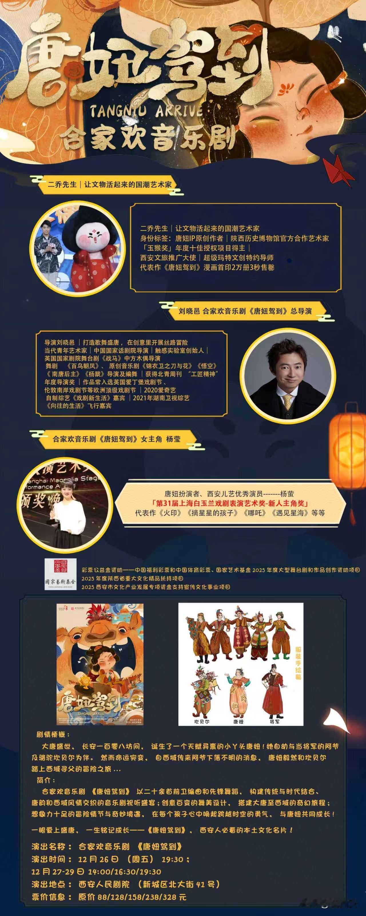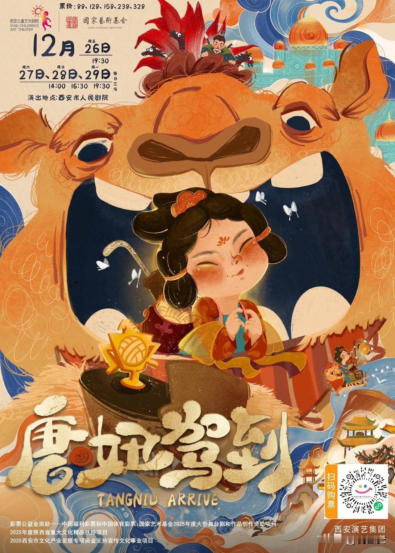 由西安儿童艺术剧院倾力打造的合家欢音乐剧《唐妞驾到》,今晚将在西安人民剧院首演!西安身边事 西安生活 音乐剧 这部以本土知名IP形象“唐妞”为核心的奇幻冒险剧,将丝路历史作为叙事主脉络,利用“公路片”架构展现唐妞与骆驼坎贝尔的西域寻父之旅;剧中加入20余首原创音乐,配以先锋舞蹈及百变舞美,营造出沉浸式大唐穿越体验。 主创阵容堪称豪华,导演及编舞由担任舞台剧《战马》中方木偶导演的刘晓邑执导,而饰演唐妞一角的杨萤,曾获上海白玉兰戏剧表演艺术奖新人主角奖。值得一提的是,该音乐剧还被列入国家艺术基金2025年度资助项目。 演出时间:12月26日 19:30(首演),12月27-29日每天连演三场 演出地点:西安人民剧院(地铁钟楼站D口) 可在西安文旅惠民、“西安市青少年活动中心梦想剧场”、大麦、猫眼等平台查询