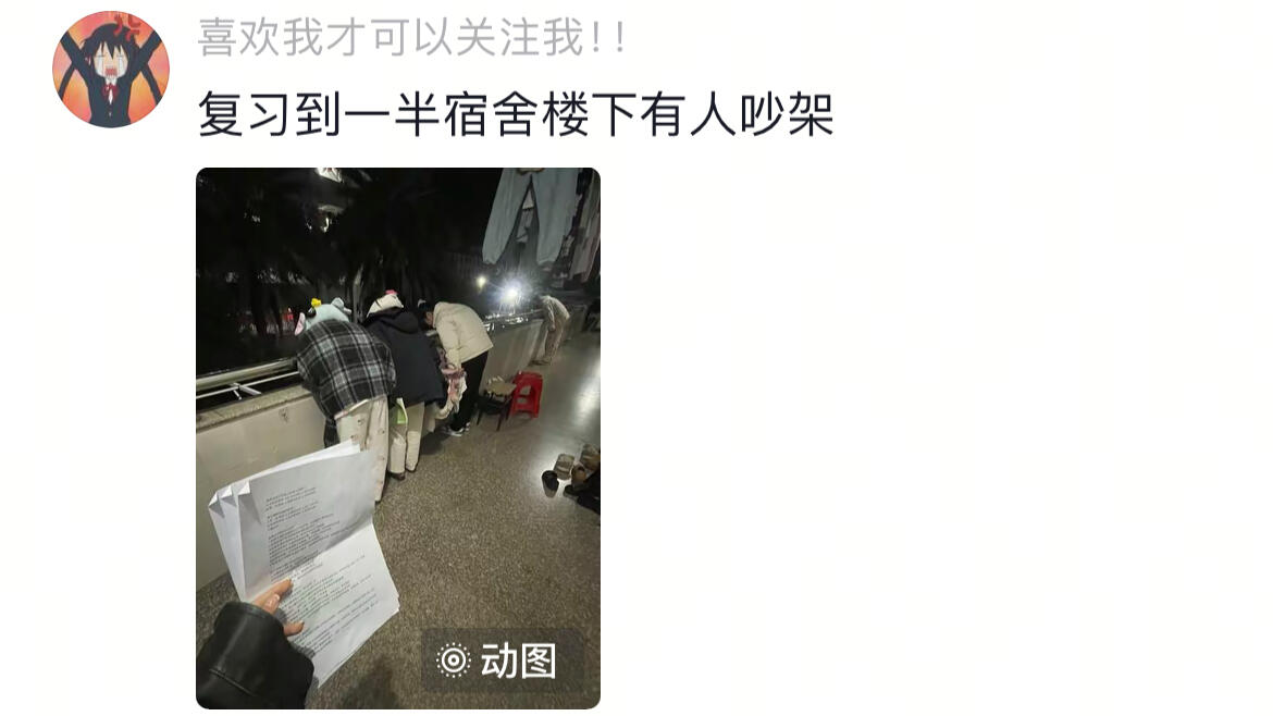 复习到一半,宿舍楼下有人吵架