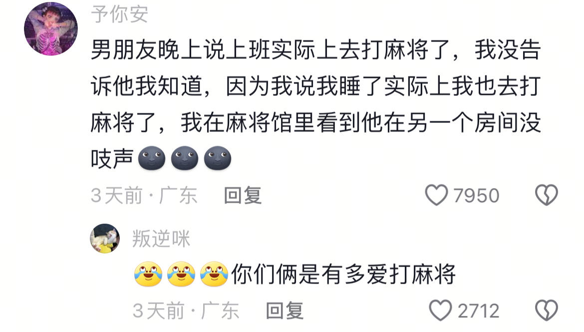 男朋友晚上说上班实,际上去打麻将了,我没告诉他我知道,因为我说我睡了实际上我也去打麻将了,我在麻将馆里看到他在另一个房间没 吱声