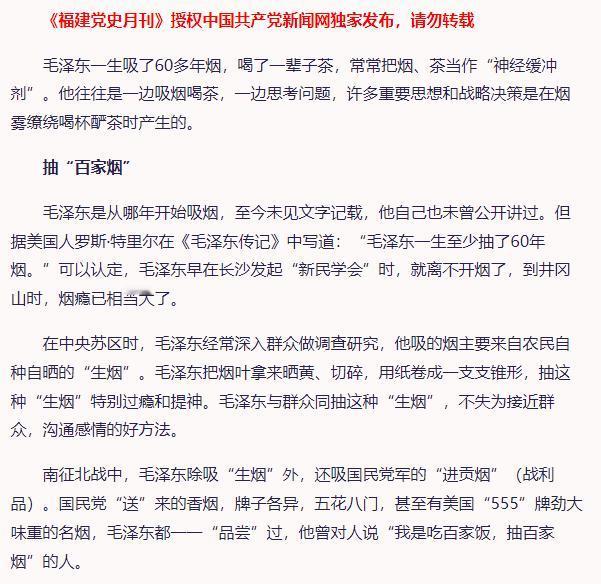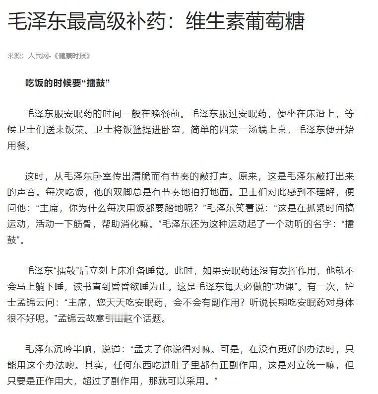 虽然毛主席活到了83岁,但他的保健医生却透露:“其实毛主席不具备长寿的条件,他长寿是因为本人比较注重保养。” 毛主席老烟民这个毛病大家都知道,烟不离手,有时候一天抽多少根,身边人都看着直皱眉,工作作息也没个点儿,常常是夜里不睡觉,白天补觉,即便这样,毛主席的长寿经也是一门大学问。 他不是完全不在乎身体,反而骨子里特别较真,他的养生方式不是什么高深理论,也不是现在流行的那些补品、调理,更多是他自己琢磨出来的门道。 比如说,他特别喜欢游泳,不管多大年纪,能下水就下水,游泳完了,整个人神清气爽,说在水里啥都不想,啥烦恼都能抛开。 除了游泳,毛主席还喜欢走路,尤其是散步,不管天冷天热,外面雪下得再厚,也敢出去踩一踩。 他觉得走路有助于思考,也能让身体放松,他还自创过一套简单的动作,什么转头、提肩、扭腰这些,别人看着简单,他却能坚持每天都做,其实这都是他对自己的一种要求,觉得“人得动”,不动就容易出毛病。 毛主席的饭桌永远不花哨,基本就是几样家常菜,主食喜欢杂粮,大米饭里还要掺点别的粮食,他吃东西讲究杂食,什么都能来两口,最喜欢的反而是最普通的食材。 鸡脖子、小鱼小虾、泥鳅,甚至一些别人不爱吃的东西,他都觉得有味道,有人想给他补点什么,他还不爱听,觉得那些高档补品没什么用,身体好坏主要还是靠自己平时养出来的。 他还推崇饮食要节制,哪怕桌上有好东西,他也不多吃,觉得吃多了反而有负担,他身边的医生也说,主席对补品很抵触,能不吃就不吃。 有时候医生想办法把维生素掺进茶里,他一喝出来,还要打趣一句:“你们就知道搞小动作,我心里都有数。” 毛主席的作息其实挺“野”的,年轻时候打仗,白天黑夜都得随时准备,养成了晚上精神头十足,白天反倒迷糊的习惯,哪怕新中国成立以后,身边人想帮他调整,他也没往回拽,老觉得夜里脑子灵光。 医生多少次劝他早点睡,他总说:“我睡得着就睡,睡不着就看书。” 但你别以为他就这样糟蹋身子,其实他时刻都在“找补”,他有自己的平衡法子,比如白天补觉,晚上工作,有人觉得这样没规律,他反倒觉得能保证精力。 他还特别注重情绪调节,常常觉得遇事不能急,心态要放平,其实这也是他的“自我修养”,觉得心情不好比吃坏东西还伤身。 毛主席的锻炼方式,说白了就是“不怕苦不怕累”,他喜欢游泳、登山,走得多、动得勤,别人觉得年纪大了不该再下水,他偏不信邪,觉得越是年纪大,越不能偷懒。 他还常常爬山,一次又一次地挑战自己的体力,身边人有时候跟不上,他还回头打趣:“你们年轻人不如我能折腾。” 他还特别喜欢自己琢磨健身的法子,有时候一套体操能做下来,身体各部位都动到了,有人觉得他动作怪,他自己却乐在其中,觉得能活动筋骨,整个人都通透了。 说到底,毛主席能撑过那么多坎儿,靠的不是身体条件有多好,而是那股“硬撑”的劲头,他自己常说,身体要靠自己养,啥事都得靠自己扛,他不怕病,也不怕累,觉得只要精神头在,什么难事都能过去。 遇到身体不舒服,他一般很少大惊小怪,能抗就抗,能自己调节绝不麻烦别人,有时候咳嗽得厉害,医生劝他戒烟,他一开始嘴上说说,后来实在扛不住,才下定决心戒掉,那股子狠劲儿,谁看了都佩服。 他还特别看重人的主观能动性,觉得健康不是天生的,主要还是靠自己努力,他常常拿自己开玩笑,说自己不是“天生神力”,只是比别人多一份坚持。 毛主席的心态特别好,遇到烦心事,他能自己消化,觉得大事化小、小事化了,哪怕遇到身体上的问题,他也不太焦虑,觉得该来的躲不过,心态上不能先倒下。 他喜欢和人聊天,聊历史、聊诗词,觉得精神世界丰富了,身体上的苦就能扛,很多时候,他用自己的乐观感染身边人,大家跟着他,心情都能好起来。 毛主席很反感“养尊处优”那一套,觉得人不能靠天吃饭,得靠自己调理,他不太相信什么长生不老,追求的是健康地活着,多做点事,他自己总结的养生经验,简单直接:遇事别着急,吃饭别贪嘴,身体得常动,不能光想着养生不干活。 他觉得,人的寿命不是全看天安排,自己努力最重要,哪怕有毛病,也不能躺平,要想办法去对抗,他身上有种“命运自己掌握”的劲头,这也是他最打动人的地方。 到了晚年,其实毛主席身体已经很虚弱了,医生让他多休息,他却总觉得时间不够用,总想多看看书、多处理点事,哪怕身体吃不消,也不肯完全放手,他觉得,人生就是一场赛跑,能多跑一步是一步。 说到底,毛主席能活到83岁,靠的不是天生的好底子,也不是命好,而是他对自己身体的那种自觉管理,抽烟、作息不规律,这些短板他自己知道,但他懂得怎么用锻炼、饮食、心态去“找补”。 说到底还是别把啥事都往心里搁,吃喝有节制,身体得常动,遇到毛病不躺平,心态别先垮,说穿了,他只是比别人更会管自己,更能坚持到底。