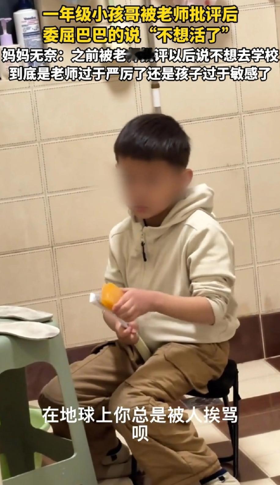湖北,一年级小孩哥被老师批评后,坐在凳子打磨着肥皂,委屈巴巴的说“我都不想活了。”妈妈惊讶不已,问他“为啥?”小孩哥更委屈了“在地球上你总是被人挨骂呗。” 现在的小孩子不比以前,接触电子产品都比较早,开智也早。这“不想活”明显就是跟谁学的,估计对意思也是一知半解。 因为之前就有类似情况发生,妈妈更应该引起重视。找个心理医生看看,开导一下孩子,很明显他现在有厌学的情况存在。 有因必有果,老师肯定有不可推卸的责任。有些老师说话就是特阴阳怪气,侮辱人,可以用不堪入耳来形容。言语就像一把看不见的利刃,刀刀不见血,却刀刀扎心! 妈妈不能只一味地怀疑是孩子敏感,有必要问问老师,问问其他同学具体情况是怎么样的。 生一个孩子不容易,养大一个孩子更加不容易,出现问题,还得尽早解决,以免出现严重后果,后悔莫及!
