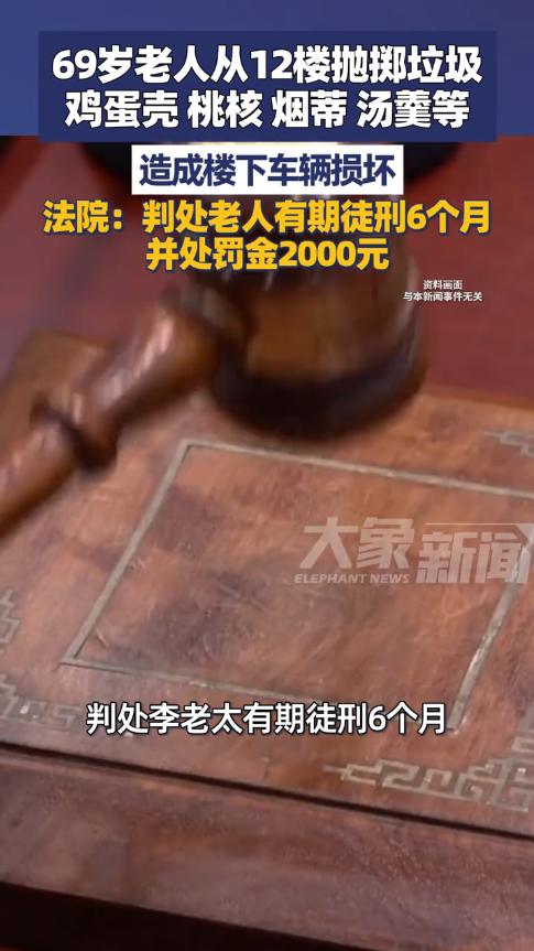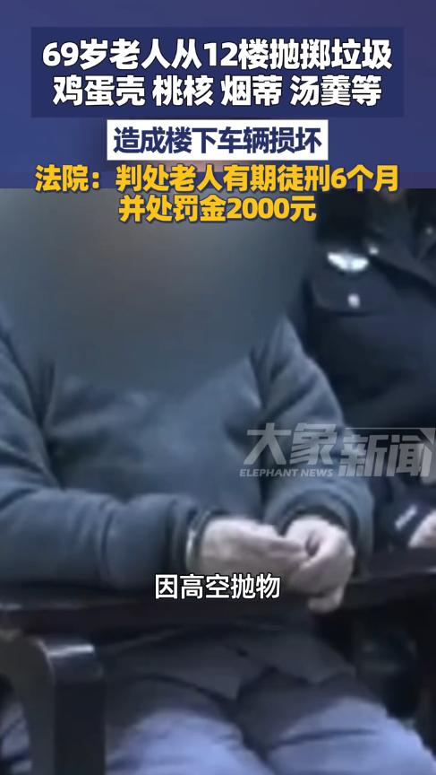 “大快人心!”近日,北京,一69岁老太为了图方便,直接将生活垃圾从12楼扔下,结果砸坏了楼下停放的汽车!车主将老太告上法庭,老太却表示当天喝大了,家中还有瘫痪的老伴要照顾,以此来博取同情。法官:有期徒刑6个月! 从高空往下扔东西,虽然方便,却十分危险,就算没有伤到人,砸坏了别人的东西也需要赔偿,以前这属于不道德的行为,但是现在却属于违法行为。 据媒体12月24日的报道,事发当天,刘老太邀请了几名朋友来家中做客,她喝了一些酒,之后为了图方便,直接将家中的垃圾从阳台上扔了下去。 自己这边是轻松了,可是却给楼下的人造成了影响!苏女士去开车时,发现车上都是垃圾,有蒜皮、鸡蛋壳、桃核,甚至还有使用过的卫生纸! 这些垃圾不仅恶心,而且苏女士的车还被砸坏了,她痛斥乱扔垃圾的人没有素质,并报了警。 民警经过调查,很快就锁定了刘老太,最终将其带走审讯。在法庭上,刘老太对于自己的犯罪事实供认不讳,但也表示家中有瘫痪的老伴要照顾,希望法官能够网开一面。 然而法不容情,法官并没有因此减轻处罚,最终判处刘老太有期徒刑6个月,罚款2000元,并支付苏女士1000元的损失。 网友看后表示,就应该这么判,年龄绝对不是“挡箭牌”,无论多大年纪,犯了法就要受到处罚,支持法官的决定! 信息来源:《69岁老太高空抛物,楼下车辆被损坏。被判处有期徒刑6个月,罚金2千元。》法治进行时