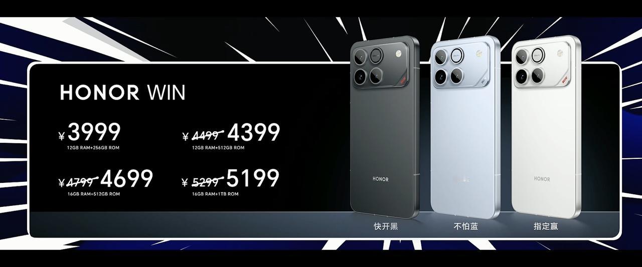 荣耀WIN发布 骁龙8 Elite Gen5处理器 LPDDR5X Ultra(Pro)+UFS4.1 安兔兔跑分超440万分 6.83英寸1.5K 185Hz LTPS直屏 100W有线充电+80W无线充电 10000mAh电池 50MP大底主摄+12MP超广+50MP IMX856 3X长焦 金属中框,3D超声波指纹 主动散热风扇,每分钟2.5万转 双1216扬声器,IP68/69/69K,抢网通信双芯 12+256 3999元 12+512 4399元 16+512 4699元 16+1T 5199元