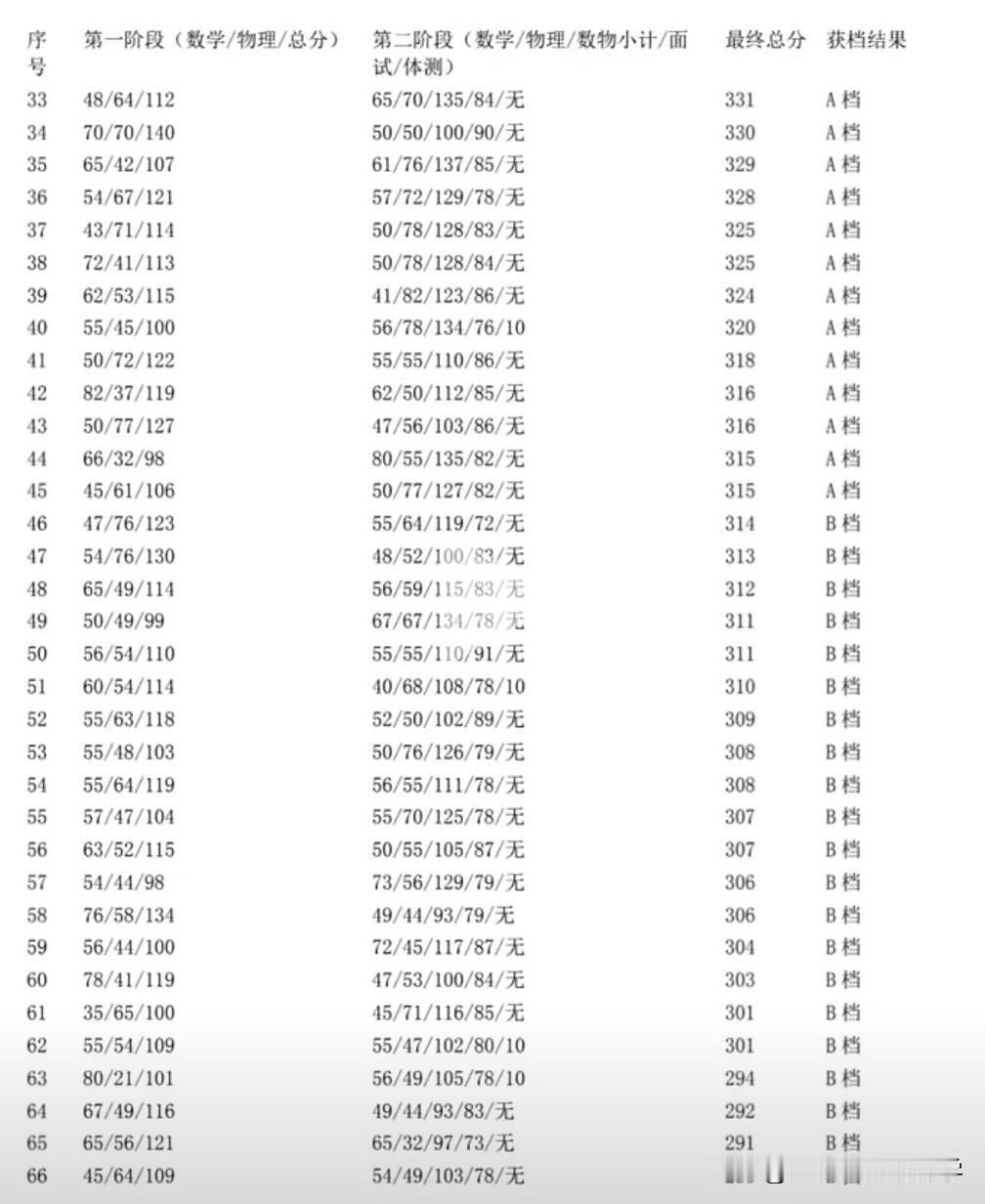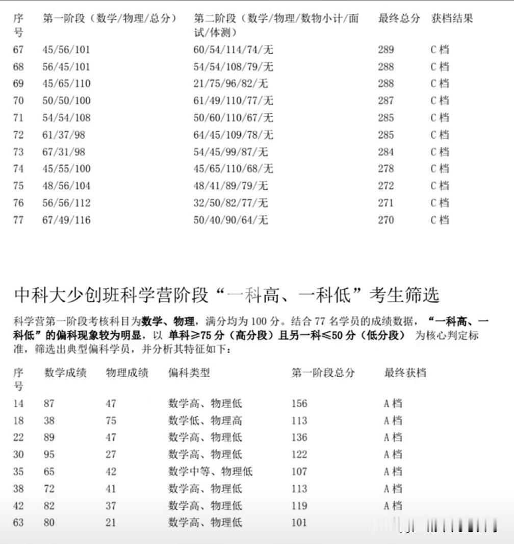 中科大少创班上岸A、B档的分数揭秘! 中科大创新科学营分第一阶段和第二阶段, 第一阶段通过的考生才能参加第二阶段, 第一阶段、第二阶段都在中科大考。 第一阶段和第二阶段的分数相加排名, 分数超过315分的是A档, 分数超过290分的是B档, 从分数上来看,明显不少考生是偏科的, 要么数学好,要么物理好, 数竞生和物竞生区分的很明显。 上岸的考生面试分数差别不太大, 基本都是80左右, 头部的学生面试都是90分以上, 面试低于80的也基本拿到的C档。
