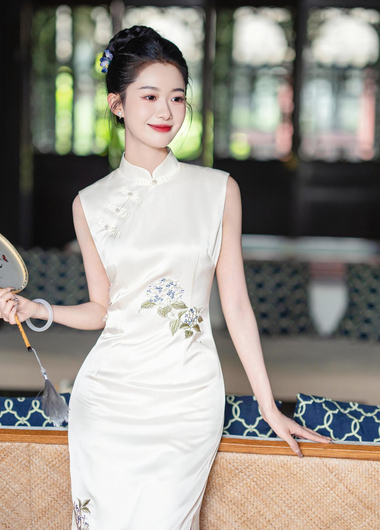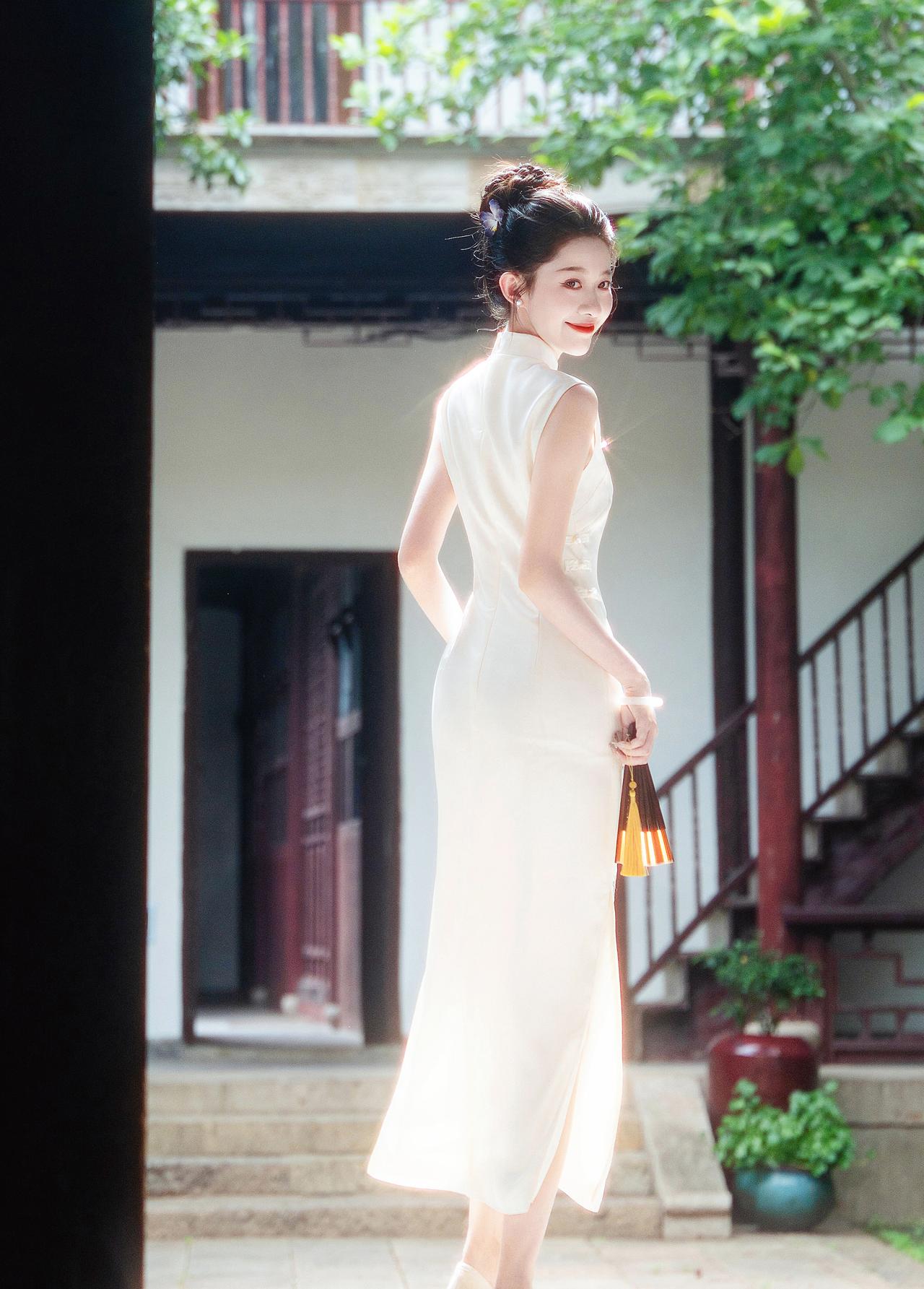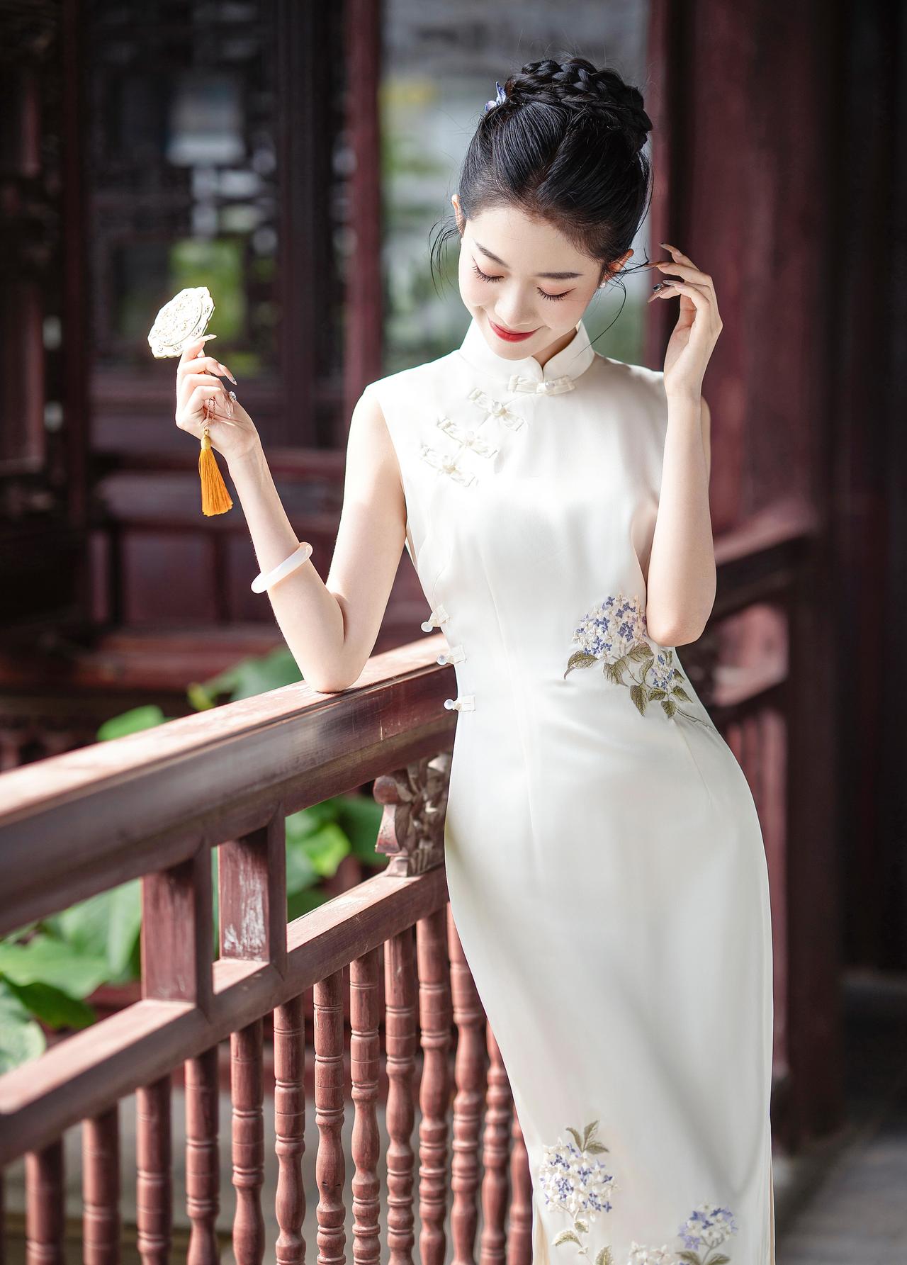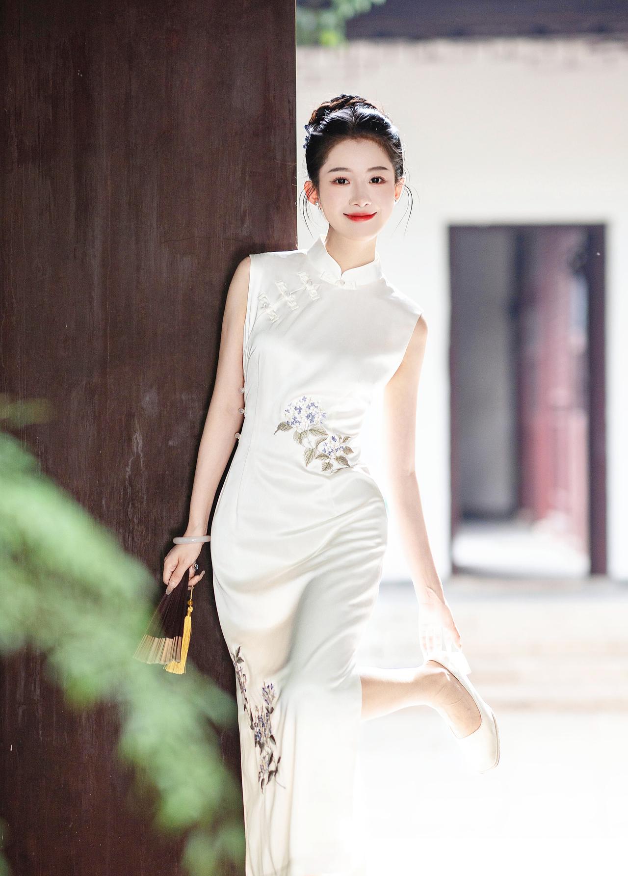 晴光一缕落襟边,白缎裁云绣紫妍。 团扇轻摇庭榭里,江南风韵入眉弯。