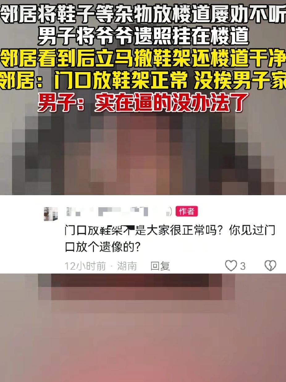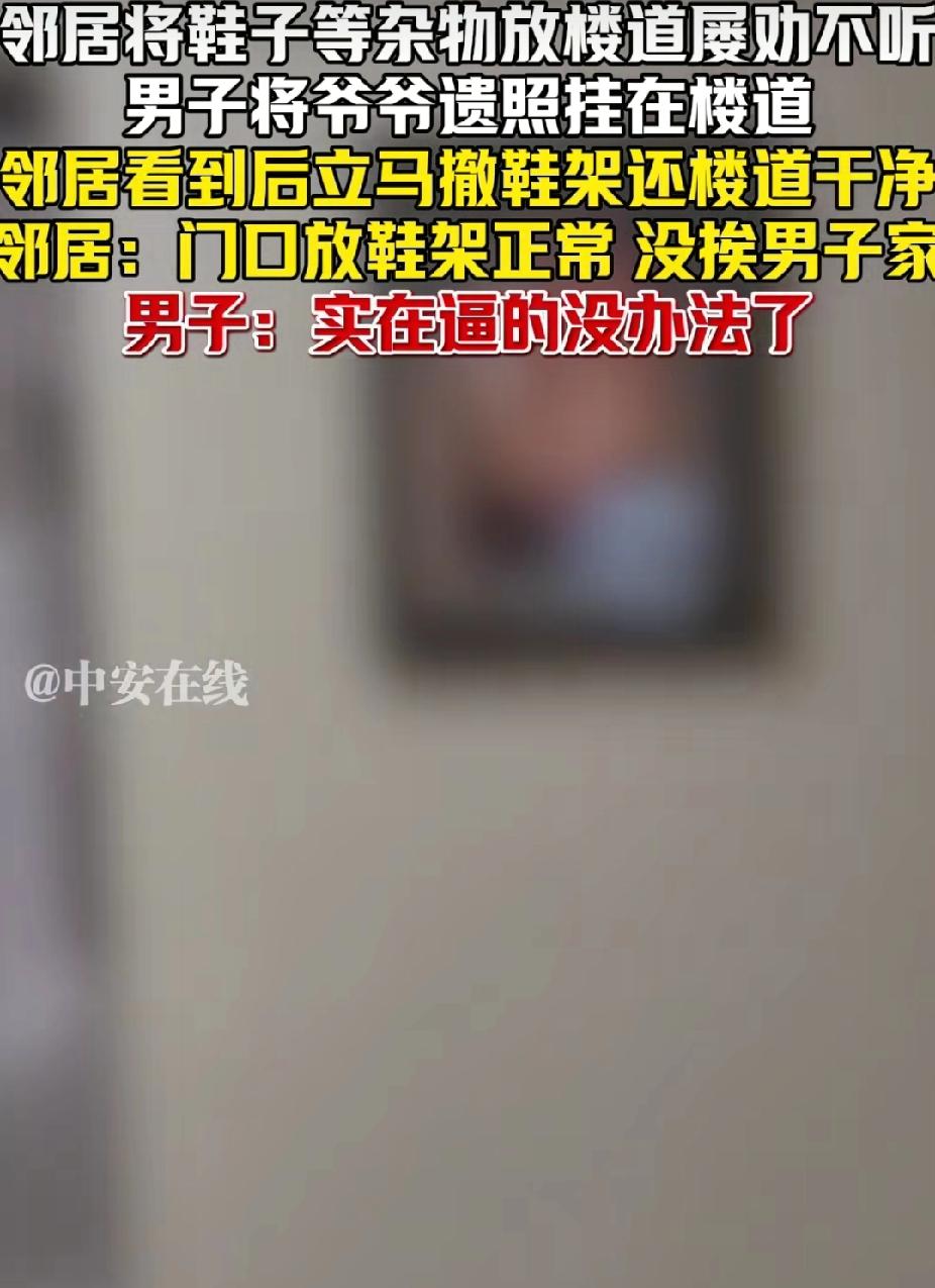 近日,湖南,男子屡劝邻居不要在楼道乱放鞋架,邻居不听。万万没想到,男子将他爷爷遗照挂楼道,结果邻居看到后,就立马把鞋架拿回屋里,还楼道干净。 原来,男子将他爷爷遗照挂在楼道的原因,是因为邻居在楼道放鞋架,他也跟邻居说过,不要在楼道里堆放鞋架和杂物。 但是男子对门的邻居认为这鞋架是放在自己家门口,是正常的,没有挨在男子家门口。 所以男子跟邻居说了几次,邻居也没有把鞋架撤走。他逼的实在没办法,这才将他爷爷的遗照挂在门外的墙上。而他这一挂,邻居就把门口鞋架撤了,楼道也干净了。 而网友们觉得男子这是“用魔法打败魔法”。 有网友说: 一梯一户或者一梯两户,两户对门超过两米五没问题,其他情况都不适合放鞋架。 也有网友说: 我买房子就看楼道,乱摆的一律不考虑,目前住的我们三户都很自觉,爱干净。 还有网友说: 有些人不占公摊面积,心里难受,这就是平时占便宜占惯了。 这事看起来有点哭笑不得,到是却折射出邻里矛盾的普遍困境。 像遇到这种情况,你和对方讲道理、好言相劝,有时候收效甚微。而公共空间被占用,通风采光受影响,还存在安全隐患,这些道理谁都懂,可有些人就是装不懂。 《民法典》明确规定业主对公共区域享有共同权利、承担共同义务。邻居屡劝不改,已侵犯他人权益。而男子会选择这种方式,恰恰说明正常沟通渠道已然失效。 男子用的这招,可能是触动了邻居的心理防线。 在中国传统观念里,遗照带有肃穆庄严的意味,邻居见后心里发怵赶紧把鞋架收了,实属意料之中。这招“以礼制非”虽非常规手段,但却精准抓住了邻居的心理软肋。 其实这一幕无关迷信,只是是让人突然意识到,自己的行为始终在他人“目光”之下,那份理直气壮顿时消散。 不过,这方法可遇不可求,而且也不宜提倡。因为此法实则是双刃剑。虽然见效快,却易激化邻里矛盾。这挂遗照本是对逝者的尊重,用作“武器”欠妥,若对方的态度强硬,那么反可能引发更大的冲突。 且依赖“震慑”而非真正解决问题,并非长久之计。 遇到这种情况,理想的解决之道,仍应回归理性与规则。可向物业、社区反映,依据《消防法》和物业管理条例等规定处理。 社区调解、建立公约比“以怪制怪”更利于长久和谐。 邻居及时收走鞋架是好事,但若因此心存芥蒂,反而埋下隐患。 最后,都说远亲不如近邻,互相体谅才是长久相处之道。楼道方寸之地,是共同的家门,不是谁家的储藏室,照出的是公德心与包容心。 (来源: 中安在线)
