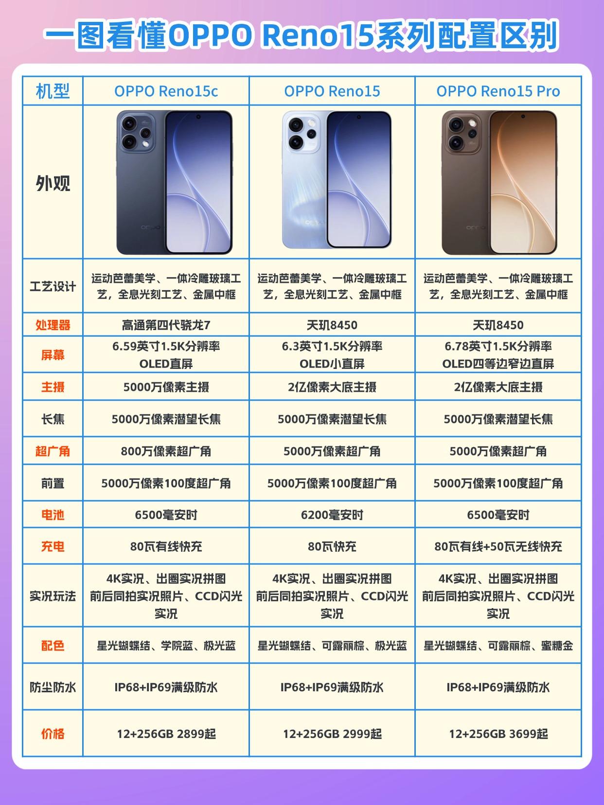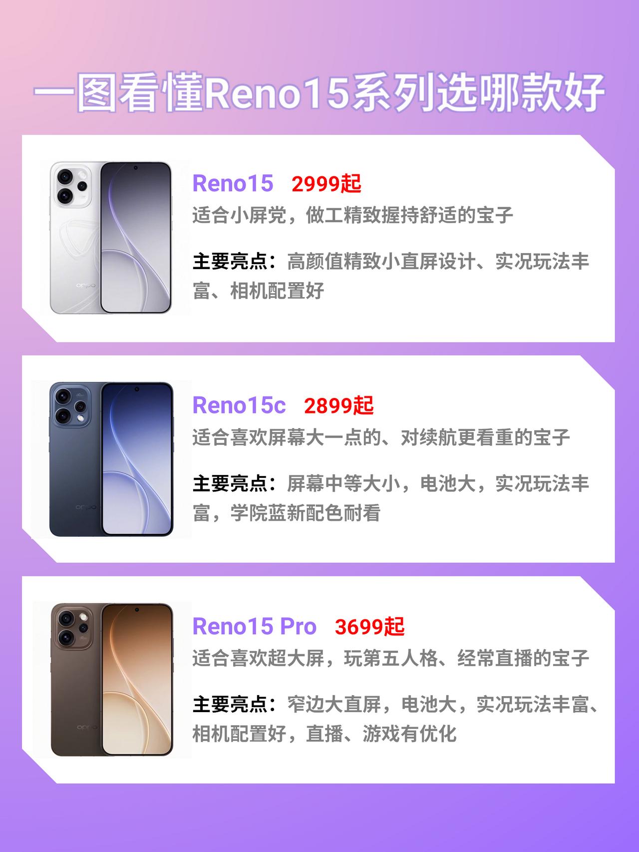 OPPO Reno15系列,三款机型怎么选? 年底了打算换手机,预算2-3k 本来是看网友说OPPO Reno15系列卖爆了 周围也有人买了,所以就想着自己也换这款 但后面看发现居然有三款机型,就有点纠结住了,这选哪款好啊? 估计有不少人和我一样有这个问题吧 看了下,Reno15标准版是小屏的 2亿像素是有的,配置跟Pro比差不多 玩游戏拍照这些都可以。 Reno15c屏幕比标准版大一点,电池也更大一点,续航应该会好不少,就是处理器和超广角变了,便宜100,相机功能玩法和系统都一样~ Reno15 Pro是窄边框大屏是和Find X9一样的设计,刷视频应该更好点,电池也比基础款大,配置拉满 这个窄边直屏我很喜欢 游戏第五人格有高帧优化和HDR超清画质 现在就是有点纠结,我总结了一下把配置区别放在图片里了,不过还是不知道入哪款好比较性价比高一点,大家有啥建议哦?