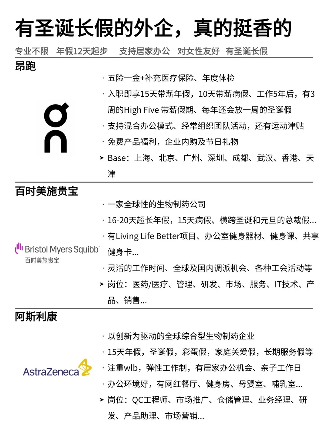真的是没想到,真的有这么多都有圣诞假,甚至还有从圣诞放到明年!真的有狠狠羡慕,外企福利假期这块做的真的很好! · 为什么还是值得去外企? 🎄年底竞争压力小;岗位全面,背景和要求也很低 🎄对女性友好,假期丰富,基本上都是10天起步,还有各种额外假期 🎄很多还都支持居家办公、福利完善,是真的能实现WLB · 坚持日更✊🏻,帮大家在找工作路上顺利拿 offer! ·