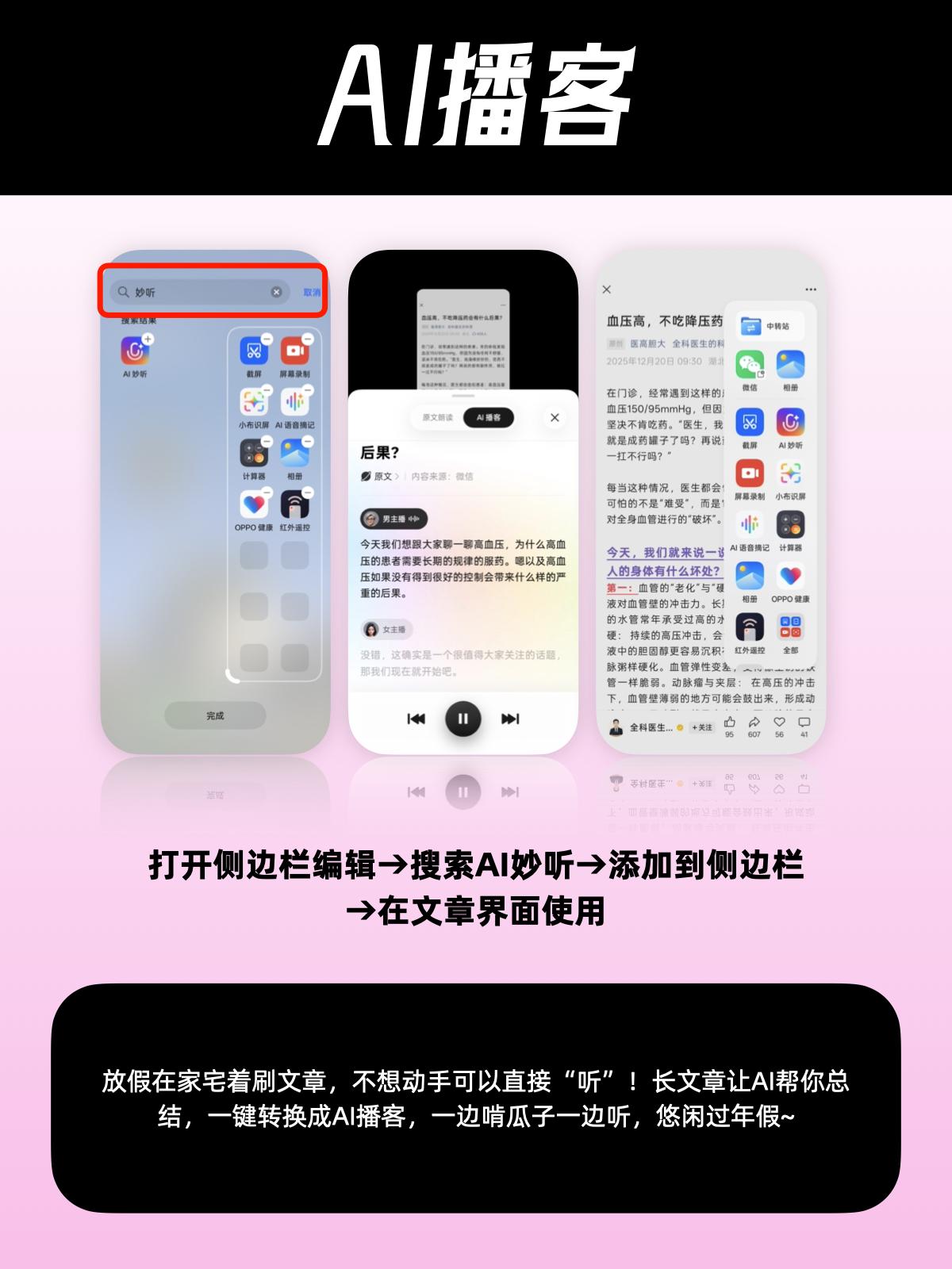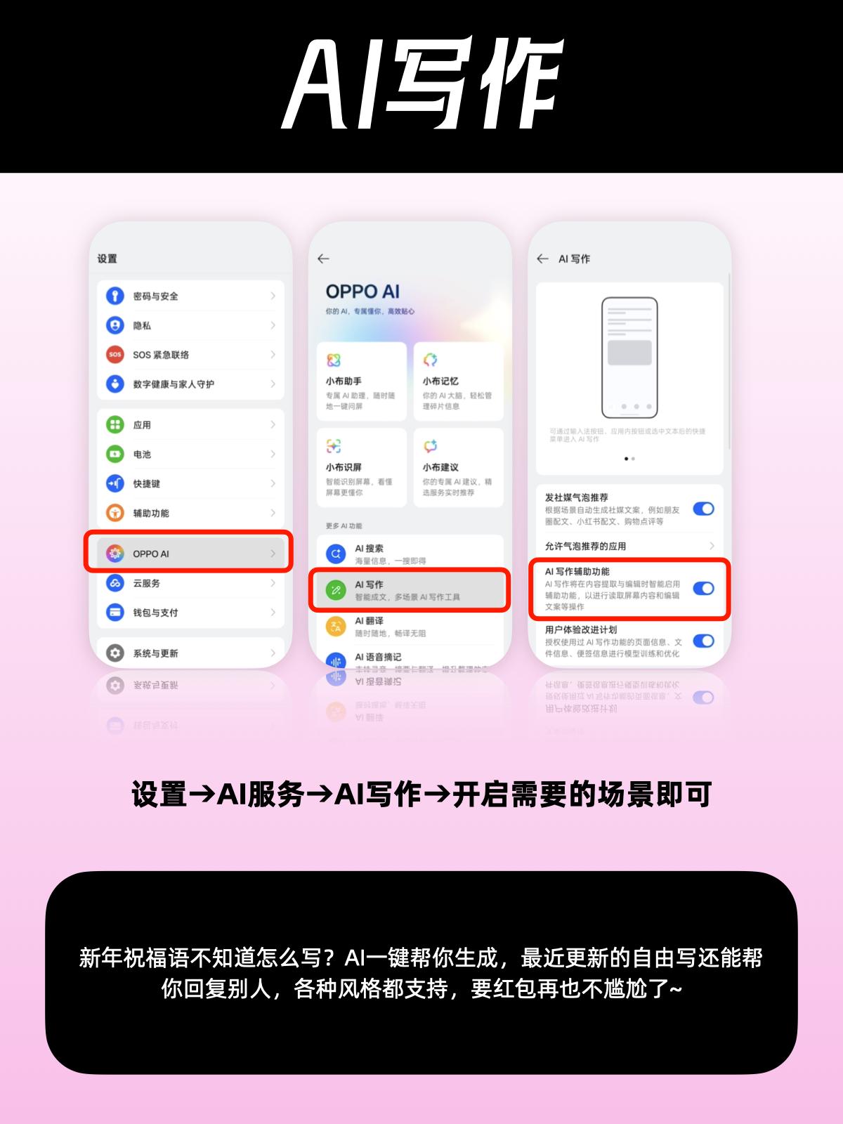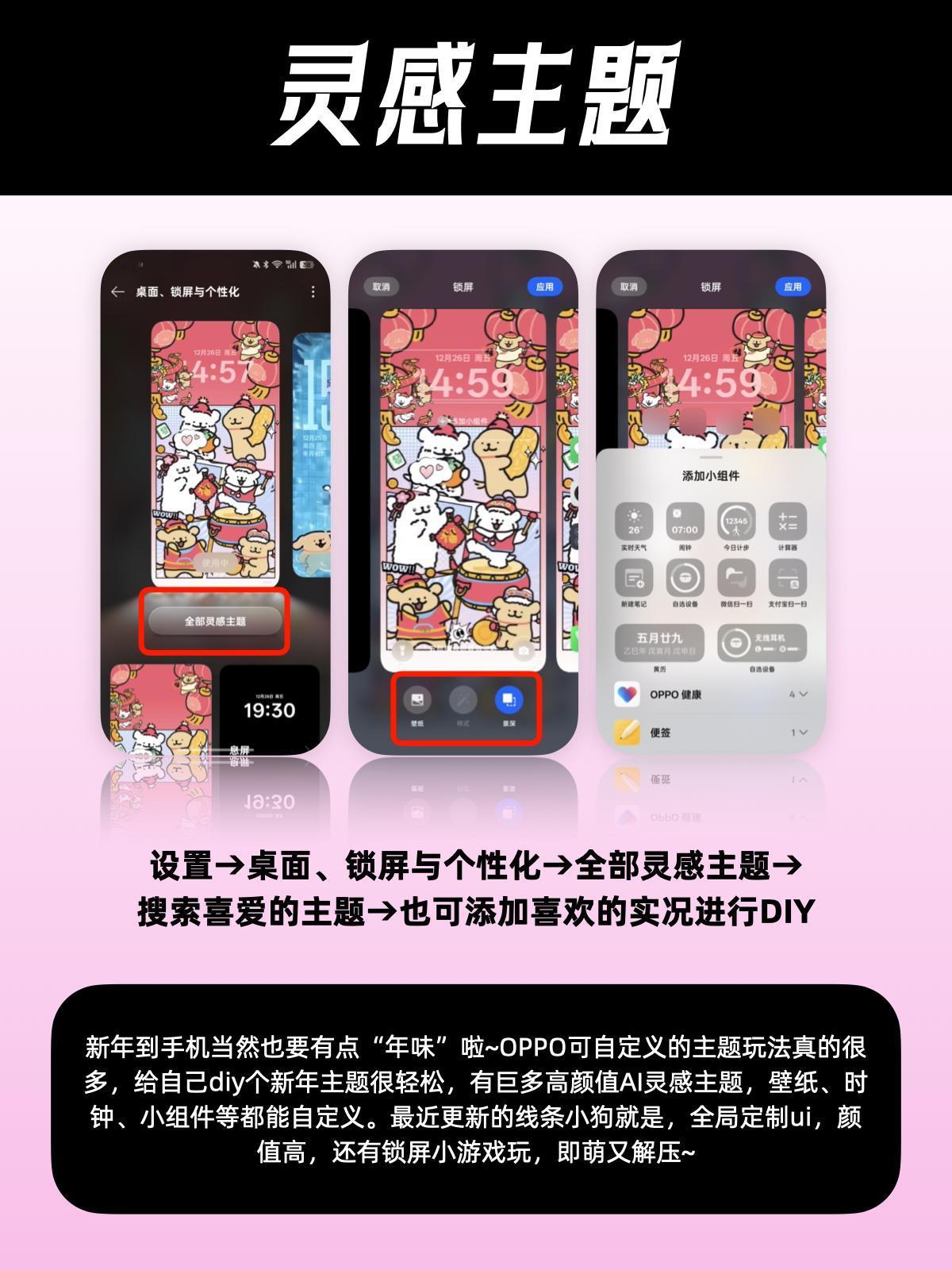 OPPO 手机必学的5个功能,过年用上舒服的嘞~ 年底好多人换手机,想换OPPO手机的不少 作为OPPO老用户被问最多的就是有啥活动?怎么入手划算?有啥实用的功能... 👇这里给大家整理了5个实用功能,过年用上舒服的嘞~ 📱示例机型:OPPO Find X9 Pro(ColorOS16) 1️⃣灵感主题 新年到手机当然也要有点“年味”啦~OPPO可自定义的主题玩法真的很多,给自己diy个新年主题很轻松,有巨多高颜值AI灵感主题,壁纸、时钟、小组件等都能自定义 最近更新的线条小狗就是,全局定制ui,颜值高,还有锁屏小游戏玩,即萌又解压~ 2️⃣AI播客 放假在家宅着刷文章,不想动手可以直接“听”!长文章让AI帮你总结,一键转换成AI播客,一边啃瓜子一边听,悠闲过年假~ 3️⃣AI写作 新年祝福语不知道怎么写?AI一键帮你生成,最近更新的自由写还能帮你回复别人,各种风格都支持,要红包再也不尴尬了~ 4️⃣AI人像补光 年假出去玩自然得美美出片啦,吃饭的时候拍照光线太暗,拍出来的照片偏黑不用担心,直接用AI人像补光即可,废片一招拯救~ 5️⃣出圈拼图 拍完的照片想发分享也有新玩法,出圈拼图解锁3D感满满的实况live图,让你成为圈里最靓的仔! 现在OPPO手机的玩法太多了,近期打算入手的也是赶上了,过几天OPPO会开启新年活动,到时候再入手更香(看图7),我都嫌我自己Find X9 Pro买早了😭新年打算换手机的可以关注下~