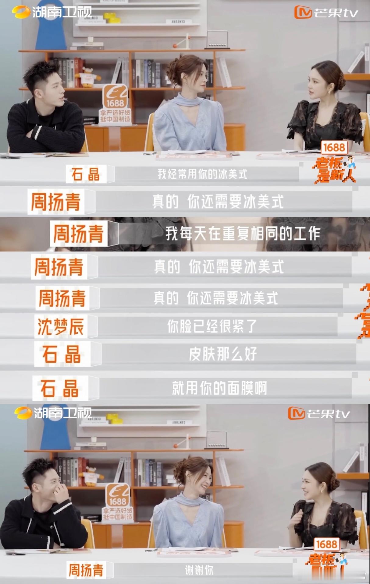 周扬青石晶商业互夸 聊到自家产品两人眼睛直接放光!你夸我品牌有实力,我赞你产品超好用,这波事业脑之间的互夸,又真诚又好笑
