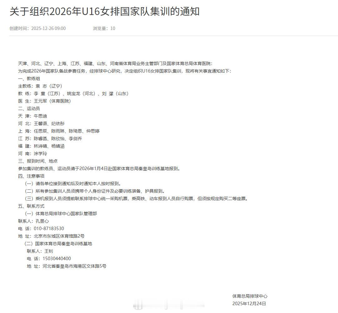 【2026U16女排国家队集训名单】中国女排12月26日,体育总局排球中心发布2026U16女排国家队集训通知。教练组如下:主教练:袁志(辽宁)教练:李童(江苏)、姚宝龙(河北)、刘濛(山东)医生:王元军(体育医院)队员如下:天津:牛思迪河北:王馨语、纪依彤上海:任思辰、陈雨琳、陈琦恩、仲思婷江苏:陈睿菡、陈欣怡、李剑乔福建:林诗晴、杨婧涵河南:涂学玲 教练员和队员将于2026年1月4日赴国家体育总局秦皇岛训练基地报到。