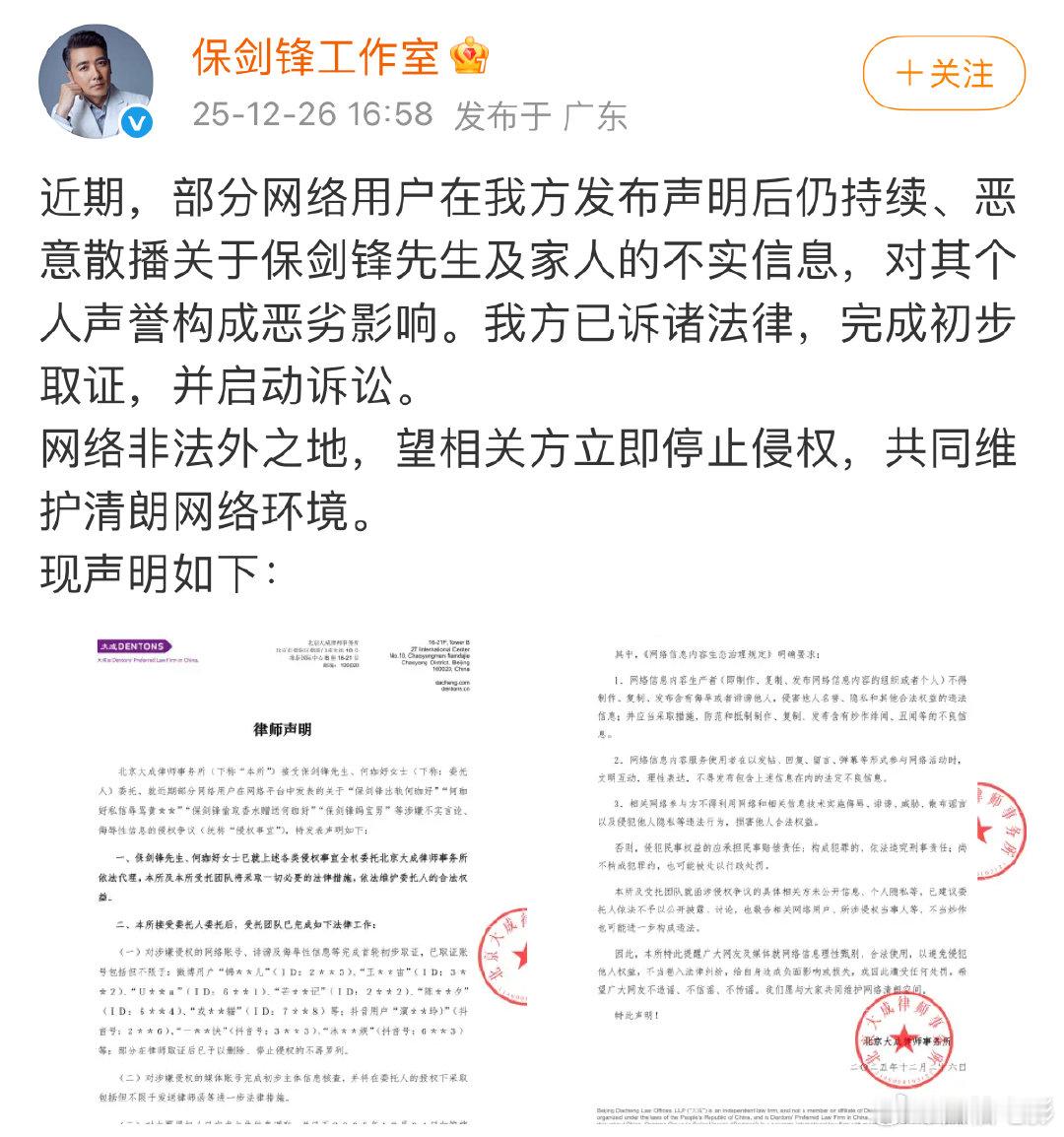 保剑锋方已取证保剑锋声明 保剑锋声明!保剑锋方已取证!“近期,部分网络用户在我方发布声明后仍持续、恶意散播关于保剑锋先生及家人的不实信息,对其个人声誉构成恶劣影响。我方已诉诸法律,完成初步取证,并启动诉讼。”