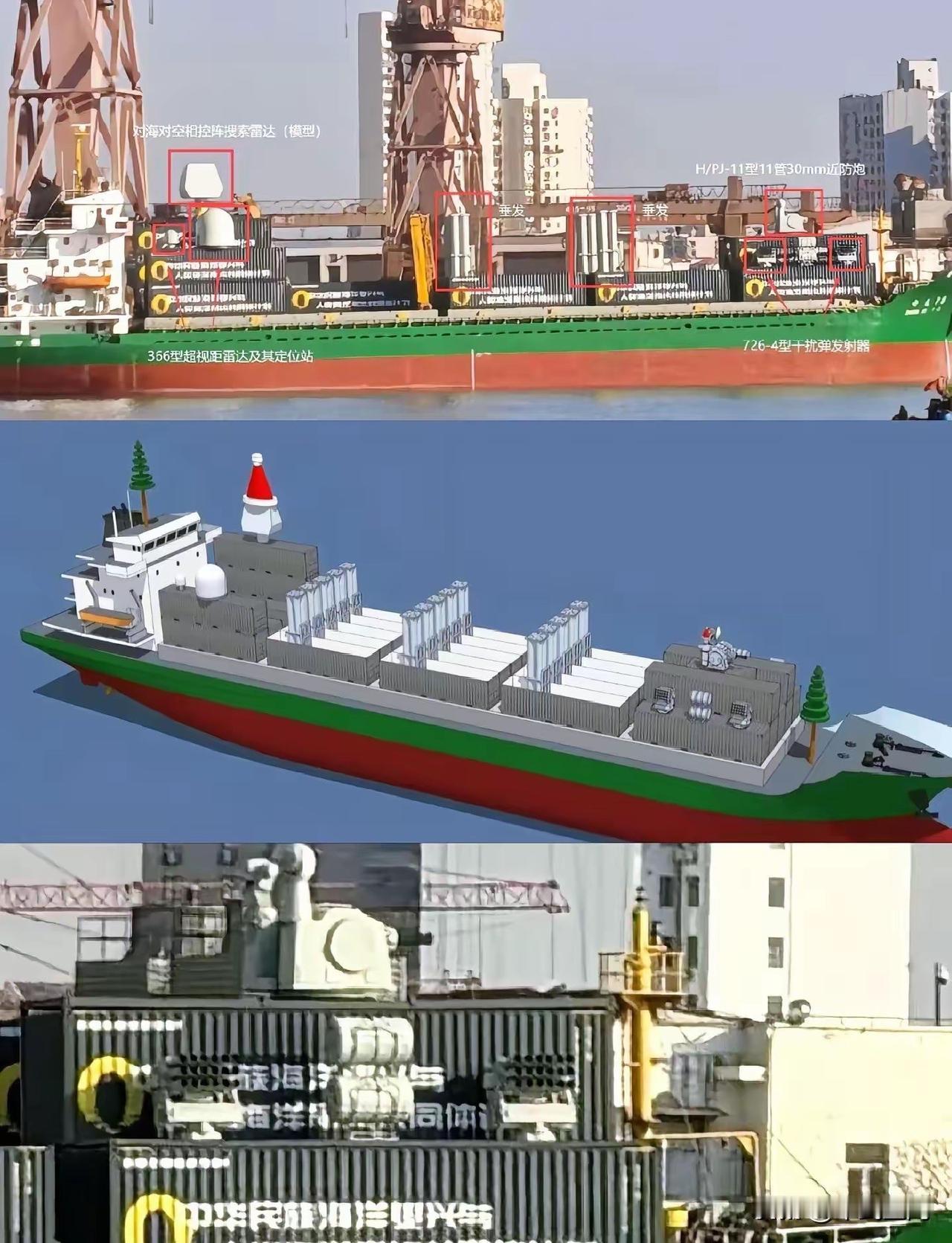中国集装箱船,速改“垂发导弹武库舰”。 近日,外媒拍摄到我国一艘“集装箱武库舰”,搭载70单元垂发装置。 有意思的是,这是一艘由集装箱货轮改装而成,而采用的建造方式就是搭积木式方法堆积武装集装箱,而里面装载的则是垂发装置、雷达系统、武器、发电机组的集装箱模块。 目前以我国的海运规模,可以快速模块化改装几千艘“集装箱武库舰”,在高烈度武装冲突下,这将是全球一支无法消灭的武装船只,而他充当的角色就是协助舰队进行饱和式攻击,以及被引导进行饱和式防空拦截。