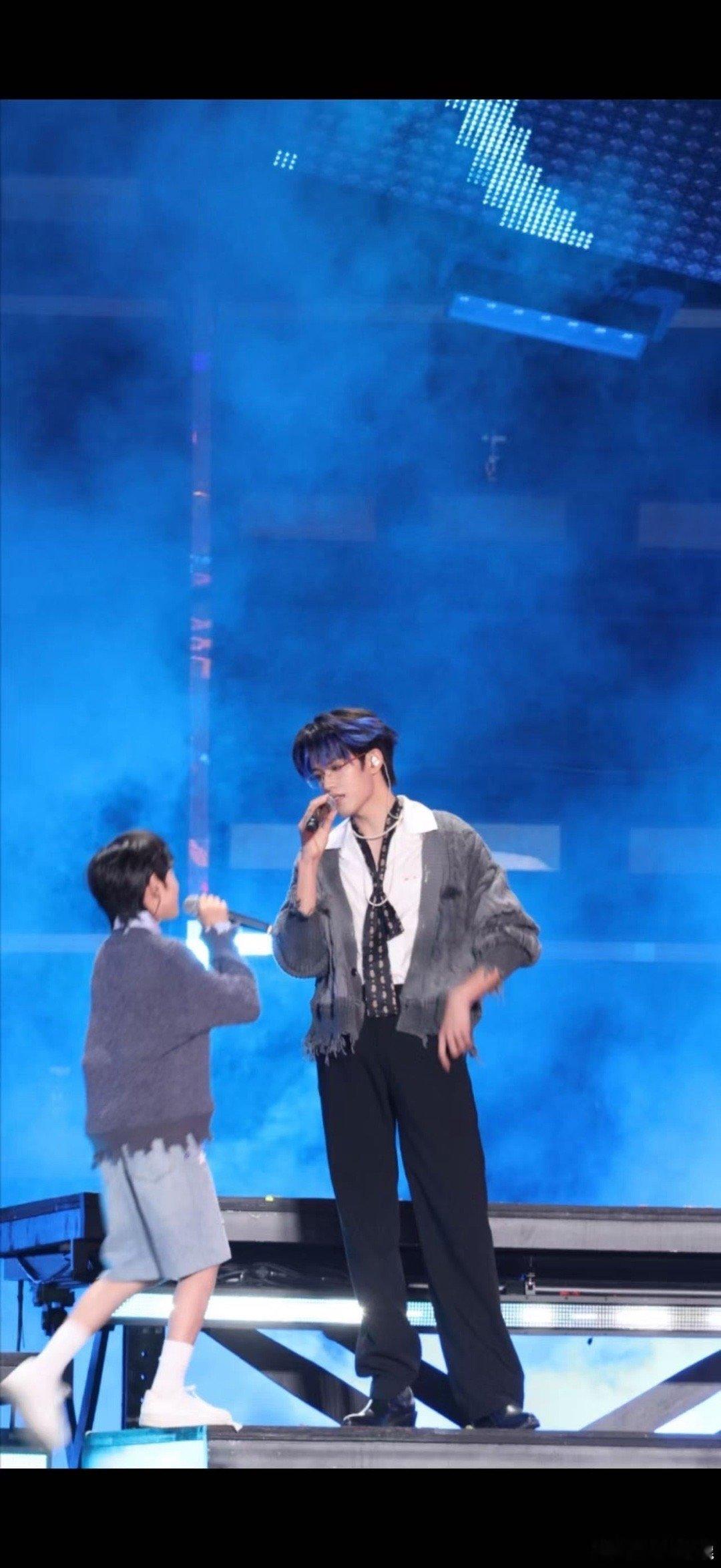 张极五代同台最萌身高差 新音同台这画面太有爱了!张极气场全开,小朋友奶呼呼的,这身高差简直萌化人心,抬手搭肩的动作太温柔,舞台氛围感拉满!