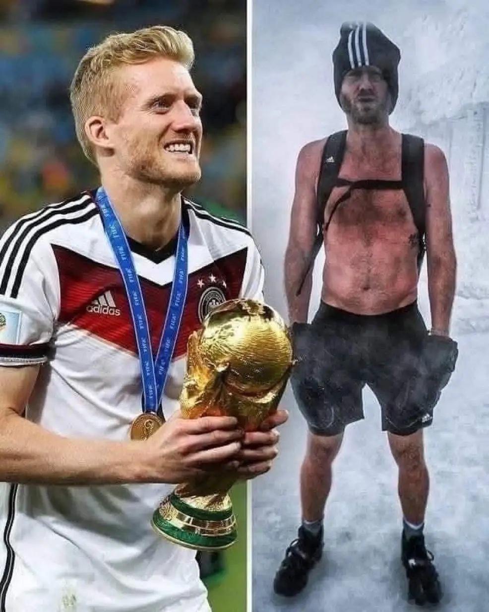 功成身退后折磨自己的典型。2014年,安德烈·许尔勒随德国队赢得世界杯冠军,他打入3球,并在决赛中助攻制胜球。仅仅9年后,年仅29岁的他就从足球界退役了。此后,他找到了人生的新方向:维姆·霍夫呼吸法,这是世界上最艰难的耐力挑战之一。他赤裸上身,只穿了短裤,就登上了捷克共和国的最高点——斯涅日卡山(海拔1630米)。舒尔勒:“最后几分钟我感觉不到任何东西,我必须从内心深处找到某种力量才能坚持下去。这是一次我永远不会忘记的经历!零下19度,迎面而来的是100公里/小时的狂风,还有暴雪和暴雨。我从中领悟到…….只要我全心全意投入,我的身体和我比我想象的要强大得多,我就能做到一切。”