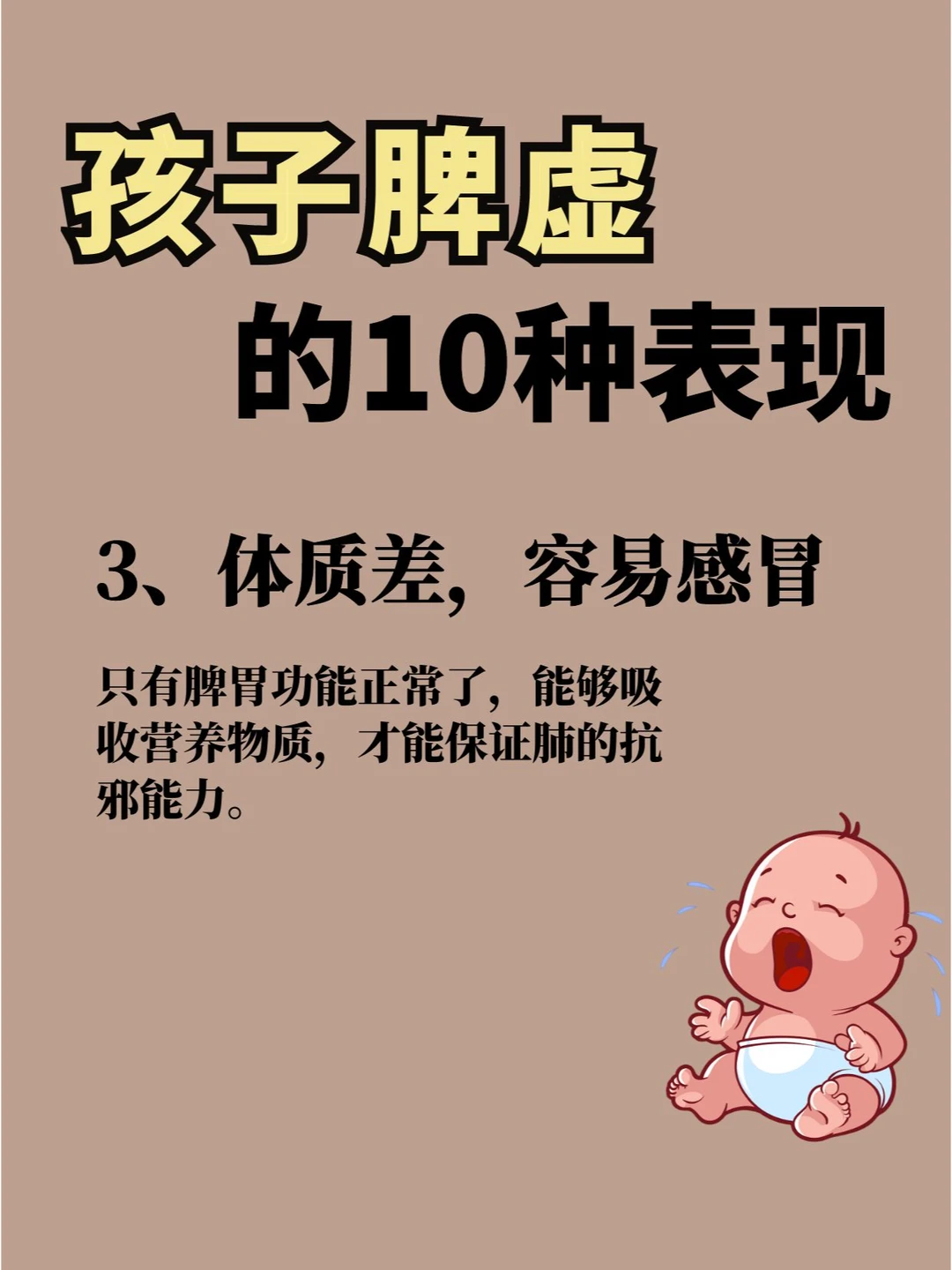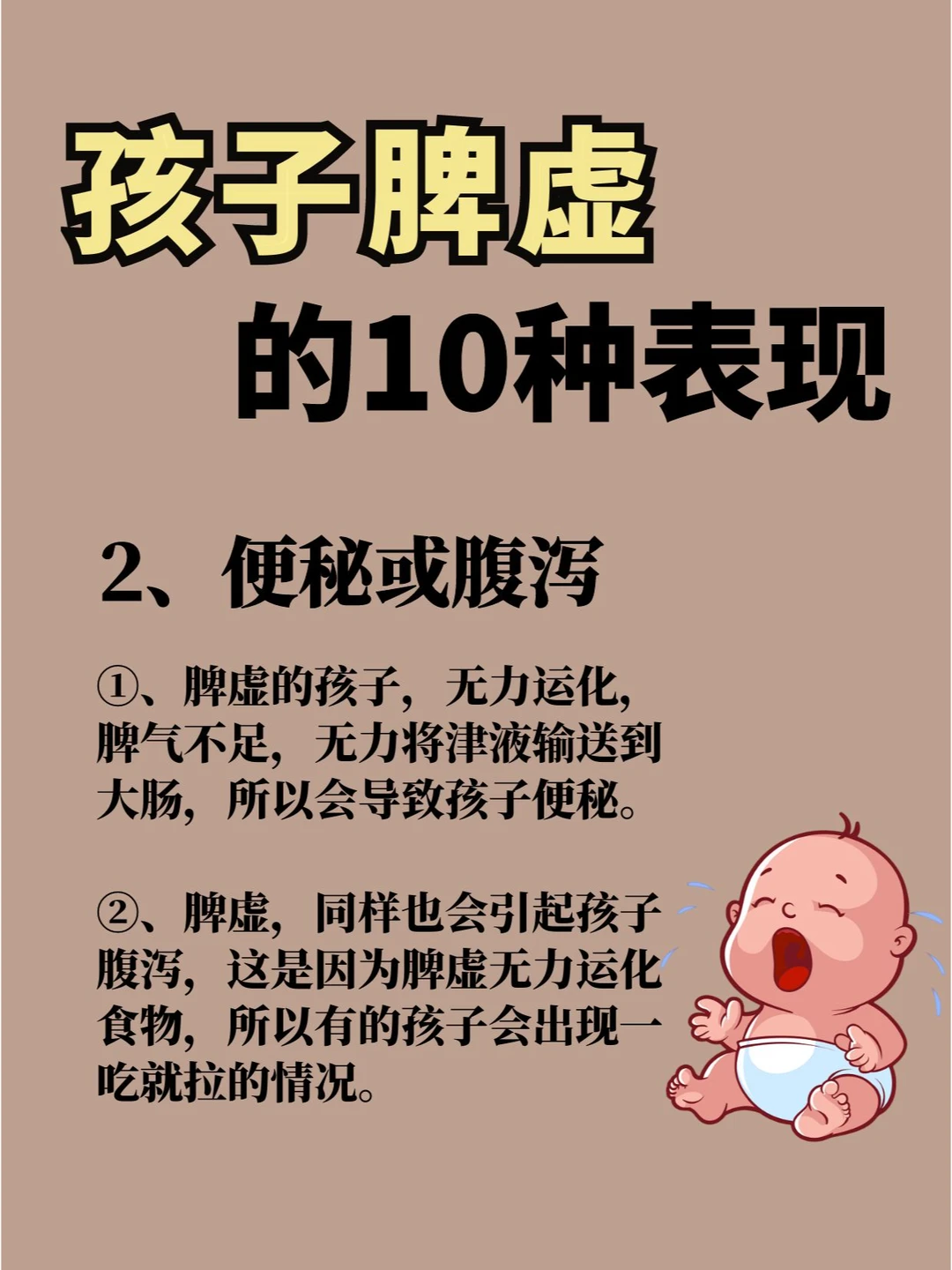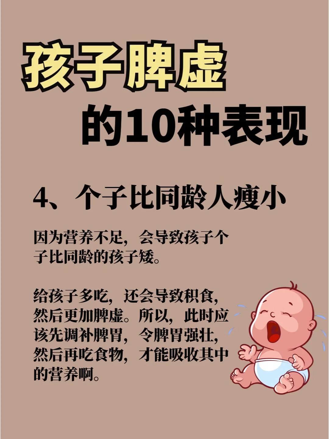 【罗大伦实用育儿,欢迎关注收藏】 ❄️脾虚的表现 1、不爱吃饭 2、便秘或腹泻 3、体质差,容易感冒 只有脾胃功能正常了,能够吸收营养物质,才能保证肺的抗邪能力。 4、个子比同龄人瘦小 5、体内湿气大,痰湿重 6、咳嗽缠绵不愈 7、脾气大,性格容易改变 8、稍一运动就出汗,夜里盗汗 9、爱流口水、睡觉露睛 10、面黄肌瘦,四肢无力 🌷孩子如何补脾? 👍小儿推拿的方法 比如捏脊,如果能够坚持,对孩子的脾胃恢复特别有好处。 再比如推脾经、揉四横纹、揉板门、揉内八卦、揉腹等等,这些方法,都有消食健脾的作用。 👍食疗方子:怀山药、莲子肉、芡实、薏米、焦三仙等,这些都是药食同源的东西,大家可以放心给孩子使用。