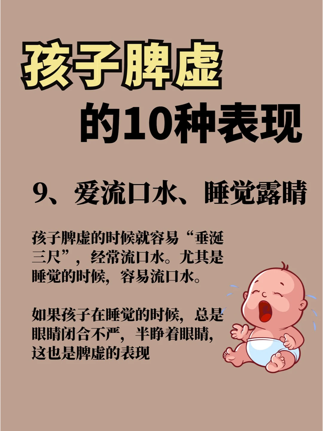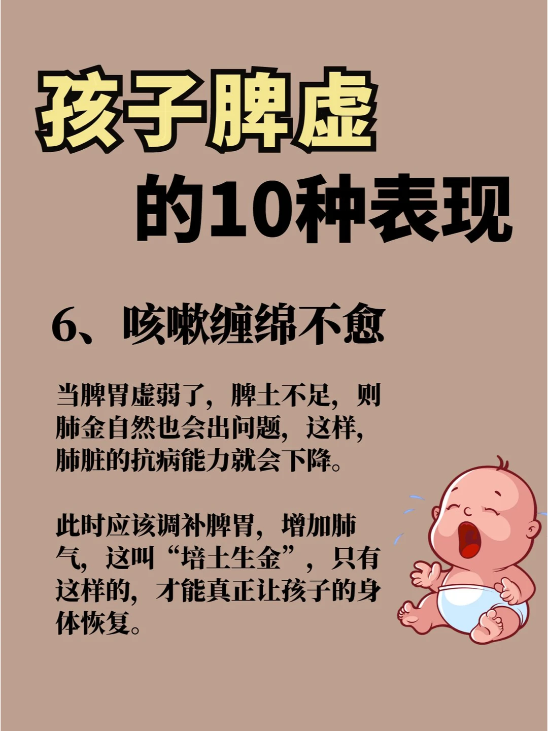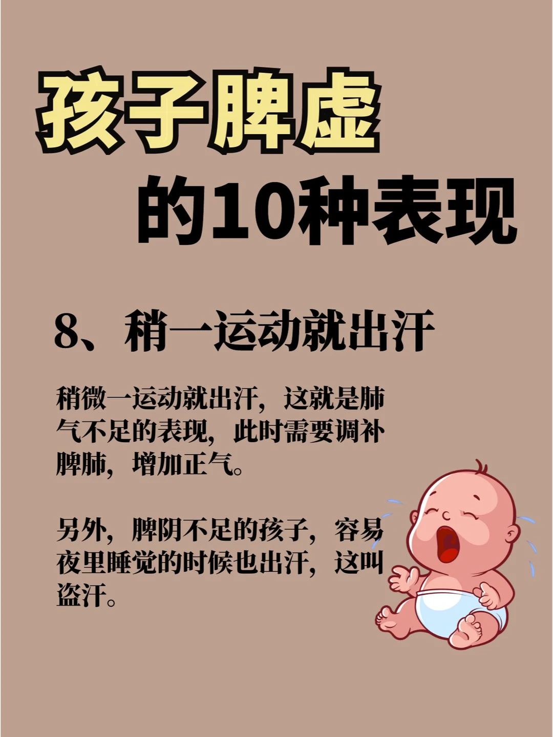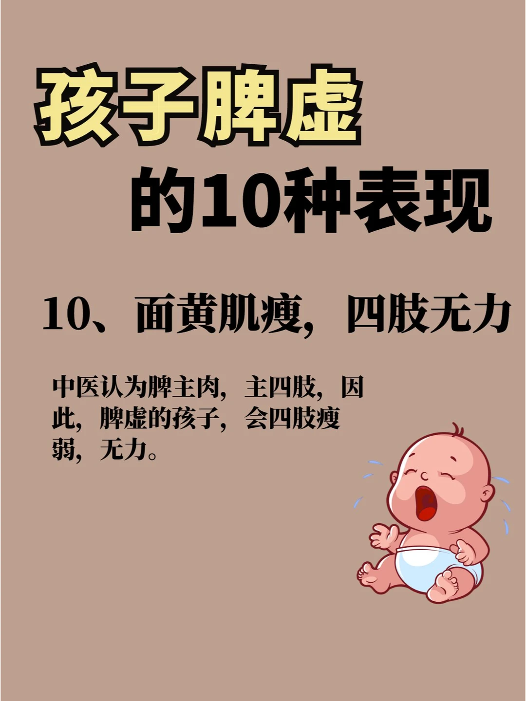 【罗大伦实用育儿,欢迎关注收藏】 ❄️脾虚的表现 1、不爱吃饭 2、便秘或腹泻 3、体质差,容易感冒 只有脾胃功能正常了,能够吸收营养物质,才能保证肺的抗邪能力。 4、个子比同龄人瘦小 5、体内湿气大,痰湿重 6、咳嗽缠绵不愈 7、脾气大,性格容易改变 8、稍一运动就出汗,夜里盗汗 9、爱流口水、睡觉露睛 10、面黄肌瘦,四肢无力 🌷孩子如何补脾? 👍小儿推拿的方法 比如捏脊,如果能够坚持,对孩子的脾胃恢复特别有好处。 再比如推脾经、揉四横纹、揉板门、揉内八卦、揉腹等等,这些方法,都有消食健脾的作用。 👍食疗方子:怀山药、莲子肉、芡实、薏米、焦三仙等,这些都是药食同源的东西,大家可以放心给孩子使用。