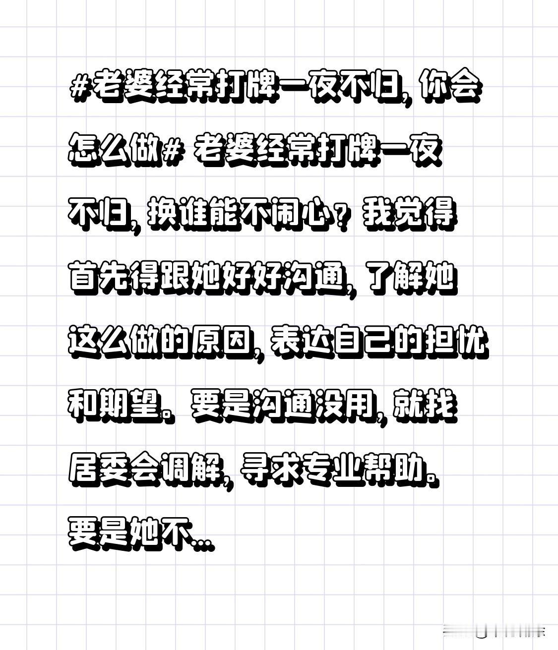 老婆经常打牌一夜不归,换谁能不闹心?我觉得首先得跟她好好沟通,了解她这么做的原因