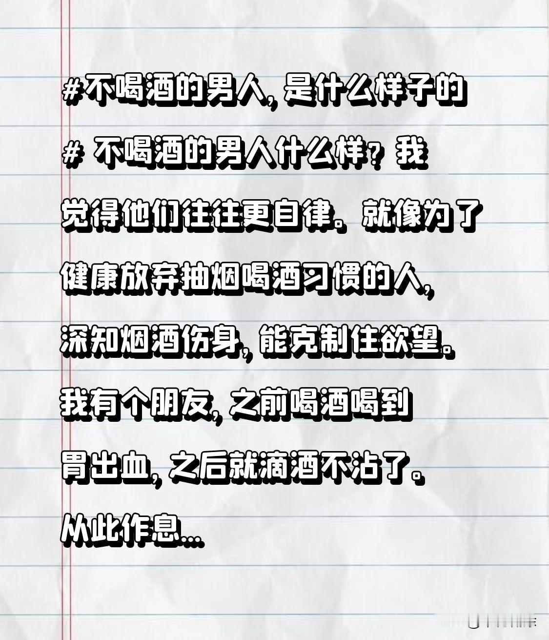 不喝酒的男人什么样?我觉得他们往往更自律。就像为了健康放弃抽烟喝酒习惯的人,深知烟酒伤身,能克制住欲望。我有个朋友,之前喝酒喝到胃出血,之后就滴酒不沾了。从此作息规律,身体越来越好。不喝酒也让他们更清醒,不会因酒精误事,能把精力放在提升自己和陪伴家人上,这种男人,靠谱!